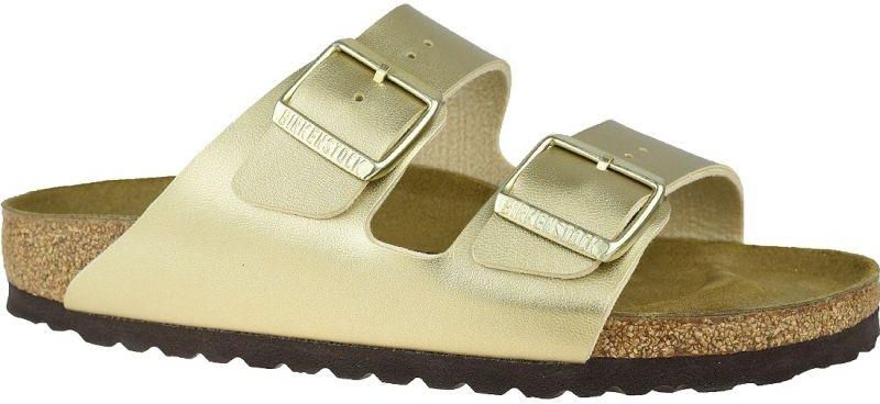 Klapki Birkenstock Arizona BF W 1016111 Właściwości powyższe obuwie Arizona 1016111 to wersja klapek specjalnie przeznaczonych dla osób o wąskiej, szczuplejszej stopie budowa wkładki pozwala na prostą postawę ciała, ponieważ stanowi wsparcie dla łuku poprzecznego stopy wyściółka jest gwarancją odpowiedniego mikroklimatu i miękkiego podłoża podniesione obrzeże buta chroni palce przed urazami solidna podeszwa środkowa wykonana została z wielowarstwowych materiałów najwyższej jakości, która amortyzuje wszelkie wstrząsy i redukuje uczucie bólu całość osadzono na podeszwie zewnętrznej wykonanej z lekkiego i elastycznego tworzywa EVA, które wygładza wszystkie nierówności podłoża Materiał syntetyczny Kolor złoty