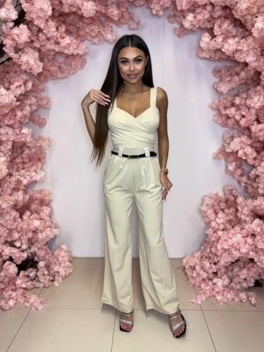 Piękny, nietuzinkowy kombinezon, odpowiedni na różne okazje. Kombinezon uszyty jest z eleganckiego rozciągliwego materiału. Góra z szerokimi ramiączkami . Wszyte miseczki pozwalają na nie zakładanie biustonosza. W pasie szeroki pas podkreślający talię w komplecie czarny cienki pasek. Prosta szeroka …