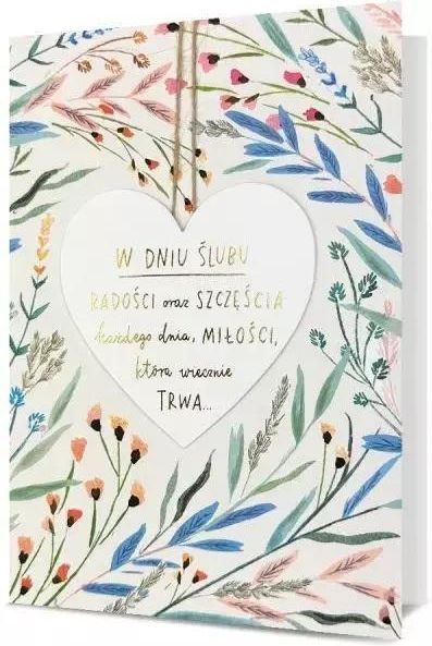 Gustowna Kartka na Ślub dla Młodej Pary Idealny dodatek do prezentu - pamiątka Wykonana na papierze ozdobnym Urokliwe detale - wykończenia Kartka składana Zdobiona listkami i drobnymi kwiatkami Serce - element naklejany ( 3D) z napisem: "W dniu Ślubu Radości oraz Szczęścia każdego dnia, Miłości, która wiecznie trwa" Zdobiona złotą folią metalizowaną Dwa sznureczki (jakby na nich wisiało serce) Wewnątrz stosowne życzenia Dopasowana biała koperta w komplecie Wymiary ok. 13 cm x 19 cm