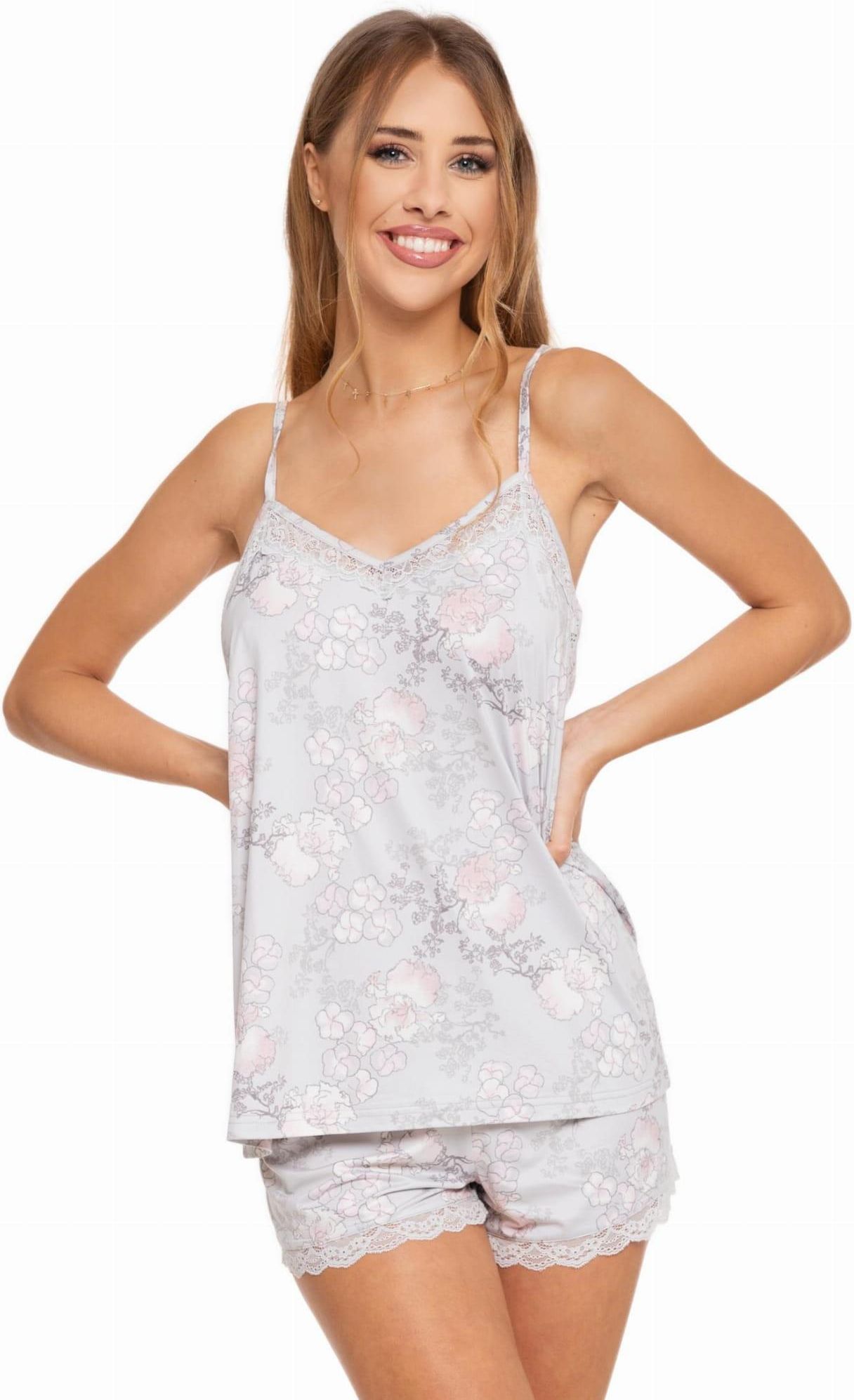 Piżama damska idealna na ciepłe noce. Koszulka na cienkich, regulowanych ramiączkach. Dekolt ozdobiony koronką. Spodnie krótkie z nogawkami wykończonymi także koronką. Całość piżamy w delikatny, kwiatowy wzór. Skład: 95% poliester, 5% elastan ROZMIAR : S WZROST 158 KLATKA PIERSIOWA 88 BIODRA 92 M WZROST 164 KLATKA PIERSIOWA 94 BIODRA 100 L WZROST 170 KLATKA PIERSIOWA 100 BIODRA 106 XL WZROST 176 KLATKA PIERSIOWA 106 BIODRA 112