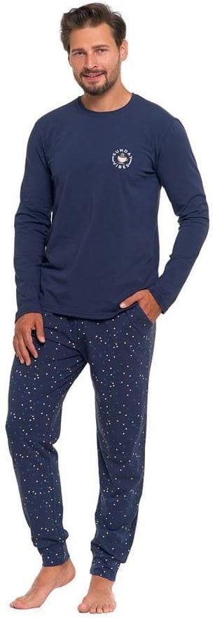 Piżama męska Moraj z długim rękawem. Koszulka jednolita w kolorze granatowym, na piersi nadruk z filiżanka kawy. Spodnie długie, ozdobione drobnymi wzorkami z kieszonkami. Nogawki zakończone ściągaczami. Skład: 95% bawełna 5 % elastan