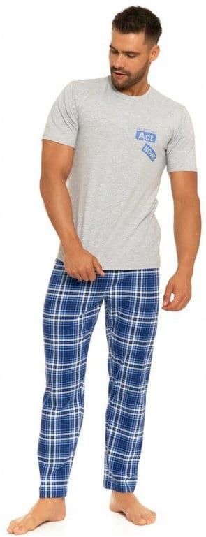 Piżama męska wykonana z bawełny z dodatkiem elastanu. Koszulka z krótkim rękawem, ozdobiona nadrukiem na piersi. Do kompletu długie spodnie w kratkę z kieszonkami i wygodną gumka w pasie. Skład: 95 % bawełna 5% elastan