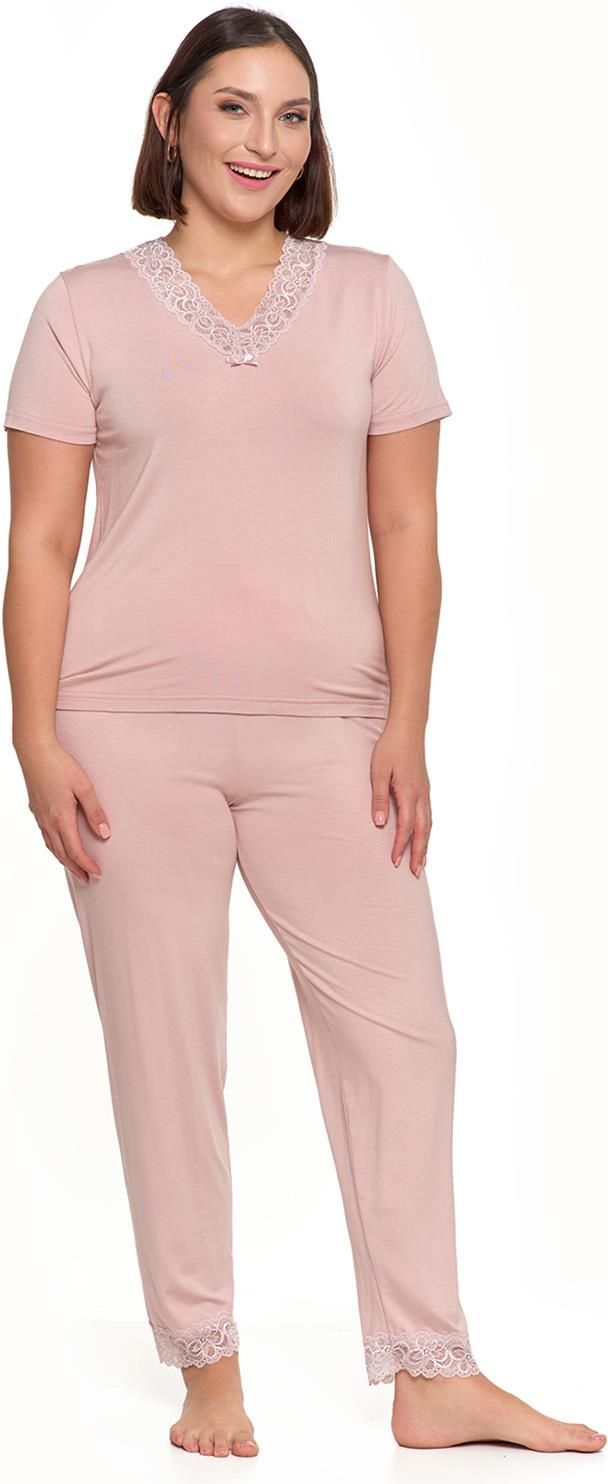 PIŻAMA DAMSKA DWUCZĘŚCIOWA BAMBUSOWA KRÓTKI RĘKAW DŁUGIE SPODNIE MORAJ XXL Luksusowy materiał: Wykonana z wiskozy bambusowej, piżama zapewnia wyjątkową miękkość, przewiewność i delikatność dla skóry. Właściwości oddychające i antybakteryjne gwarantują świeżość przez całą noc. Stylowy design: Różowa koszulka z krótkim rękawem i koronkowym dekoltem w kształcie litery V idealnie łączy elegancję z wygodą. Funkcjonalne detale: Długie spodnie z elastyczną gumką w pasie i koronkowymi zdobieniami na nogawkach zapewniają swobodę ruchów i kobiecy akcent. Ekologiczny wybór: Naturalna wiskoza bambusowa to tkanina przyjazna dla środowiska, idealna dla kobiet ceniących zrównoważoną modę. Uniwersalna, komfortowa i stylowa piżama bambusowa to doskonały wybór na każdą porę roku. Sprawdzi się zarówno na spokojny sen, jak i relaks w domu. Wybierz jakość, która dba o Twoją skórę i środowisko! Rozmiar: XXL Skład materiałowy 90% włókno bambusowe 10% elastan