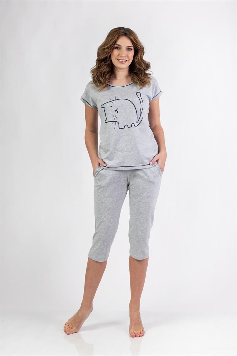 Piżama damska z krótkim rękawem, uszyta z miękkiej bawełny, Dekolt okrągły, przód ozdobiony deliaktnym nadrukiem. Do kompletu jednolite spodnie długości 3/4 z kieszeniami. Skład: 100% Bawełna