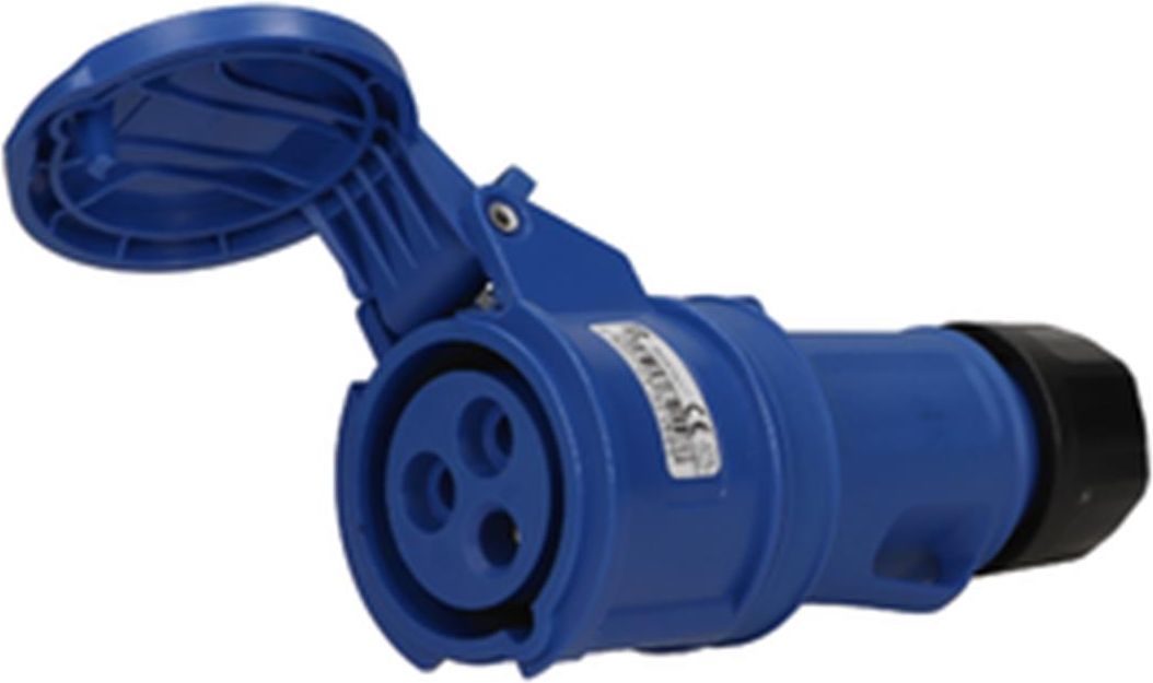 Gniazdo przenośne proste. Dane techniczne: liczba biegunów: 3 prąd znamionowy: 16 A napięcie znamionowe: 230 V kolor identyfikacyjny: niebieski znamionowe napięcie izolacji: 500 V stopień ochrony: IP44 materiał obudowy: poliamid 6, ABS materiał styku: mosiądz niklowany wysokość: 85 mm długość całkowita: 157 mm średnica dławionego przewodu: 6 – 15 mm