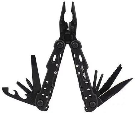 Multi Tool Mil-Tec Black Large with Case - 15406102 Poręczny multitool z dołączonym do zestawu poliestrowym pokrowcem. Narzędzia: 1. Kombinerki uniwersalne 2. Przecinak do drutu 3. Nóż z gładkim ostrzem 4. Pilnik 5. Piła 6. Otwieracz do butelek 7. Otwieracz do puszek 8. Śrubokręt krzyżak mały 9. Duży śrubokręt płaski 1 0. Mały śrubokręt płaski Dane techniczne: - długość w stanie złożonym: 110 mm - długość w stanie rozłożonym: 170 mm - materiał: stal 2Cr13, aluminium - waga: 308 g