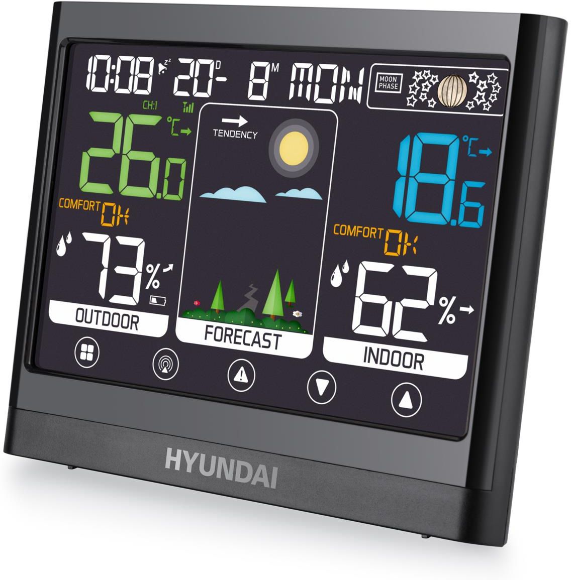 HYUNDAI – kolorowa stacja pogodowa z radiowo sterowanym zegarem STACJA POGODOWA Z KOLOROWYM WYŚWIETLACZEM LCD | ANIMOWANA PROGNOZA | ZEGAR DCF 77 | FAZA KSIĘŻYCA | WSKAŹNIK WILGOTNOŚCI | OBSŁUGA do 3 CZUJNIKÓW BEZPRZEWODOWYCH ___________ Nowoczesna stacja pogodowa HYUNDAI to idealne połączenie …
