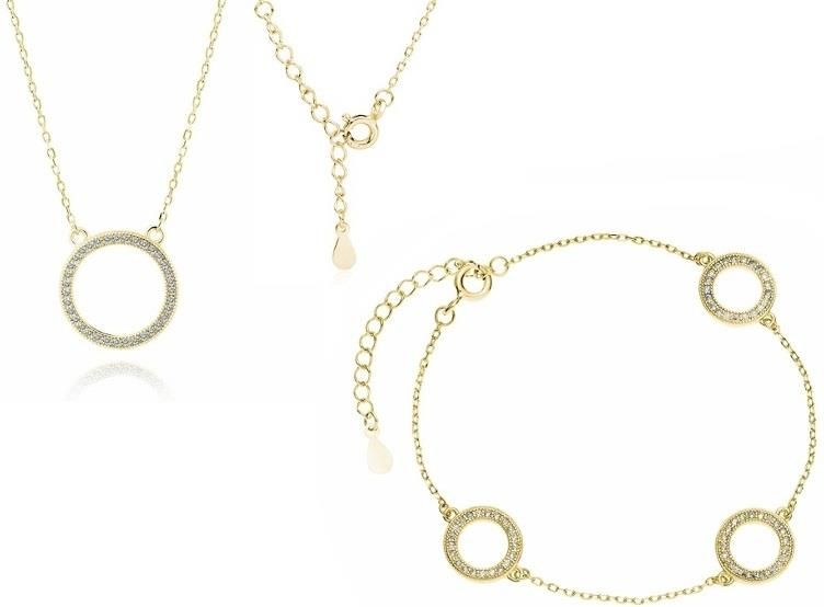 Elegancki wykonany z pozłacanego srebrna komplet gwiazd składający się z naszyjnika oraz bransoletki, zdobionych kółeczkami wysadzanymi białymi cyrkoniami, model Z1461Z2G_W.