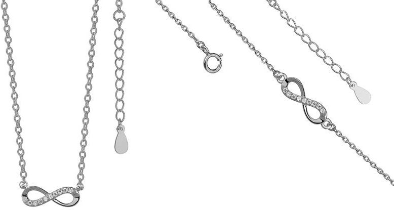 Elegancki wykonany z rodowanego srebra komplet, składający się z bransoletki i naszyjnika zdobionych symbolem nieskończoności wysadzanym białymi cyrkoniami, model Z1107Z.