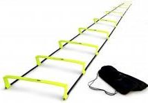 Drabinka koordynacyjna podwyższana 10 stopni Składana drabinka z możliwością podwyższenia szczebli, dzięki czemu może być wykorzystywana jako drabinka lub jako płotki. Dane techniczne: W zestawie z poręczną torbą, ułatwiającą przenoszenie i magazynowanie. Wykonana z trwałego plastiku. Drabinka składa się z 10 szczebli. Długość całkowita po rozłożeniu: 450 cm Szerokość rozłożonej drabinki: 63 cm Szerokość podwyższonej drabinki: 46 cm Wysokość stopni: 11 cm Produkt nowy w oryginalnym opakowaniu.
