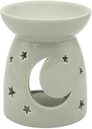 Ceramiczny kominek zapachowy z ażurowym wzorem - księżyc i gwiazdy. Wewnątrz kominka umieszcza się świeczkę, która podgrzewa wylany na wierzch wosk lub olejek aromatyczny, dzięki czemu zapach roznosi się po całym pomieszczeniu. Kominek jest bardzo ładnym dodatkiem do wnętrza i pomysłem na uroczy prezent. Zapakowany w estetyczne tekturowe pudełko. Wymiary: wysokość 13,8 cm, średnica 11 cm
