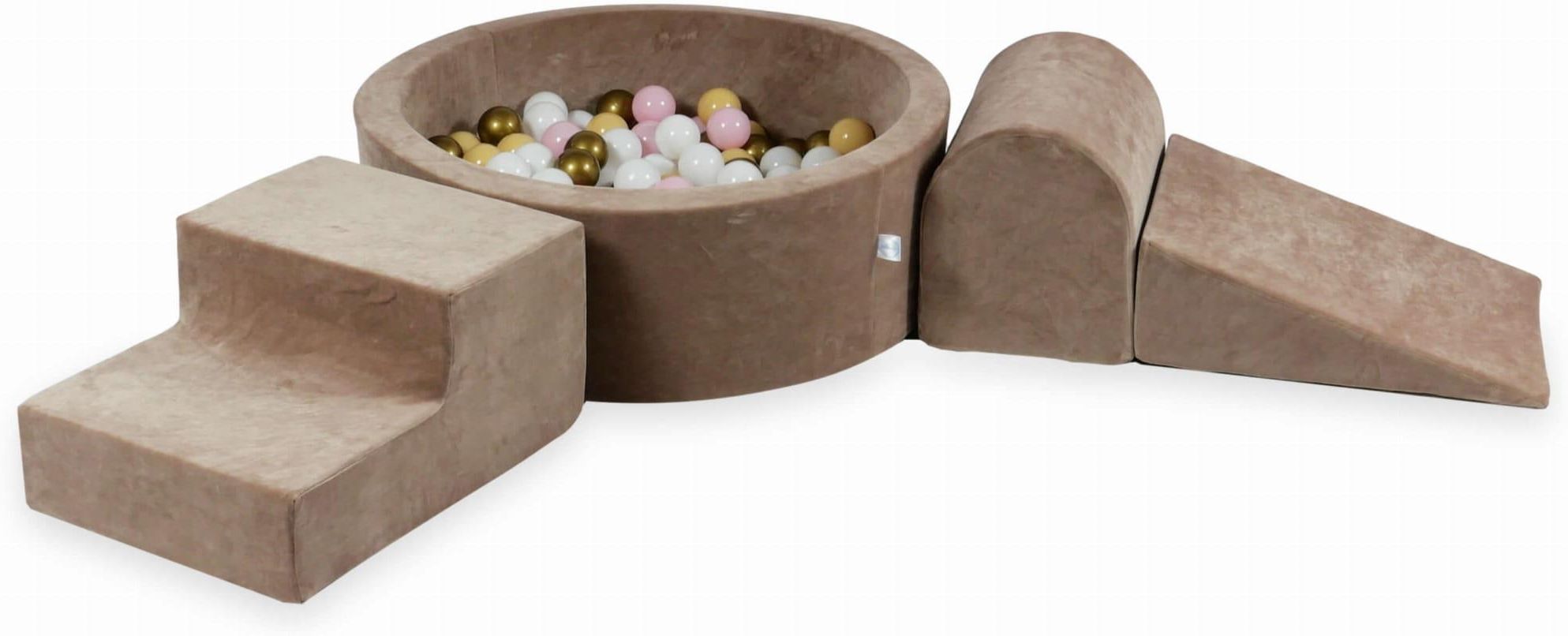 Mimii: Piankowy plac zabaw z basenem okrągłym 90x30 Velvet Soft Ciemny Beżowy + 200 piłek (białe, jasnoróżowe, beżowe, stare złoto)Piankowy plac zabaw lub jak inaczej nazywany jest - piankowy tor przeszkód to niezwykła frajda dla Twojego malucha. Właściwości: Pozytywnie wpływa na rozwój dziecka Idealnie nadaje się do zabawy (Tylko pod opieką osoby dorosłej) Niezwykła zabawa od pierwszych miesięcy życia Świetnie nadaje się na prezent!Dane techniczne: W całości wykonany z pianki Pokryty pokrowcem wykonanym z przyjemnej w dotyku tkaniny [80% bawełna, 20% poliester] Posiada certyfikat CE oraz certyfikat EN-71 Pokrowiec na zamek, zdejmowany do prania (prać w temperaturze 30 stopni Celsjusza) Produkty pakujemy próżniowo, aby zredukować wielkość paczek. (Po rozpakowaniu produkty potrzebują około 7 dni na osiągnięcie właściwego kształtu)Wymiary elementów (szerokość / długość / wysokość): Schodek: 45/60/30 cm Klin: 45/60/20 cm Górka: 45/30/35 cm Basen okrągły: 90x30 Plastikowe piłeczki do suchego basenu polski producent wykonane z nietoksycznego materiału, bezpieczne dla dzieci bardzo elastyczne, nie ulegają odkształceniu posiadają certyfikat CE średnica piłeczek 7 cmPole 'Plik' Możesz skorzystać z pola 'Plik' oraz załadować plik tekstowy lub graficzny, jeśli chcesz aby wewnątrz paczki znajdowała się wydrukowana kartka z informacją. Mogą to być życzenia lub informacja od kogo jest to prezent. Decyzję zostawiamy Tobie! (Załączanie plików nie jest obowiązkowe) Robimy krok w stronę ekologii! Jako jedni z nielicznych producentów zabawek piankowych wykorzystujemy piankę o podwyższonej gęstości. Dzięki temu, produkty z niej wykonane będą znacznie trwalsze, a co za tym idzie - będą dłużej służyły swoim małym właścicielom! Produkty pakujemy próżniowo, redukujemy dzięki temu wielkość paczek, a to z kolei bezpośrednio przekłada się na wiele korzyści. Dzięki zmniejszaniu wymiarów paczek, zredukowaliśmy również ilość ciężarówek potrzebnych do ich przewiezienia. Do jednej dziennie! Wszystkie kroki, które podjęliśmy przekładają się na mniejsze spalanie paliwa oraz mniejsze zanieczyszczanie środowiska. Uwaga! Kolory przedmiotów na zdjęciach mogą nieznacznie różnić się od rzeczywistych ze względu na różne ustawienia komputera i monitora.