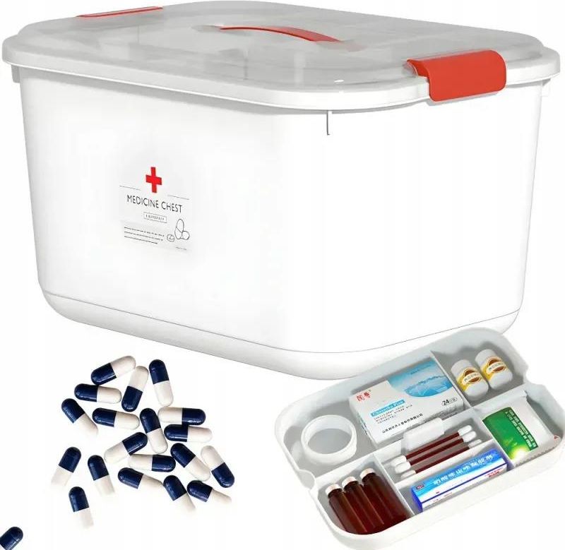 Ta funkcjonalna apteczka domowa to idealne miejsce do przechowywania wszystkich niezbędnych leków, bandaży, plastrów i środków opatrunkowych. Dzięki dużej pojemności i klarownemu podziałowi wnętrza możesz łatwo utrzymać porządek i szybko znaleźć wszystko, czego potrzebujesz w nagłych sytuacjach. Sprawdzi się w każdym domu, biurze czy samochodzie – wszędzie tam, gdzie warto mieć podstawowe wyposażenie medyczne pod ręką. PRZEJRZYSTE SEGREGOWANIE LEKÓW I ŚRODKÓW OPATRUNKOWYCH W zestawie znajduje się praktyczna wyjmowana tacka z przegródkami, która pomaga uporządkować mniejsze elementy – tabletki, maści, bandaże czy ampułki. Dzięki temu każdy produkt ma swoje miejsce, a wnętrze apteczki pozostaje czytelne i świetnie zorganizowane. BEZPIECZNA POKRYWA Z BLOKADĄ I RĄCZKĄ Przezroczysta pokrywa pozwala szybko sprawdzić zawartość bez otwierania, a solidna blokada zabezpiecza przed przypadkowym otwarciem, np. przez dzieci. Wygodna rączka ułatwia przenoszenie apteczki, dzięki czemu można zabrać ją wszędzie tam, gdzie jest potrzebna. SPECYFIKACJA TECHNICZNA Materiał wykonania: tworzywo sztuczne Wyjmowana tacka 6 przegródek Pojemność : ~20L Łatwy w czyszczeniu Wygodny w użytkowaniu Wymiary: 37cm x 27cm x 21,5cm Kolor: biało-czerowny ZESTAW ZAWIERA Pojemnik Pokrywka Tacka z przegródkami Uchwyt Zamykacze Naklejka