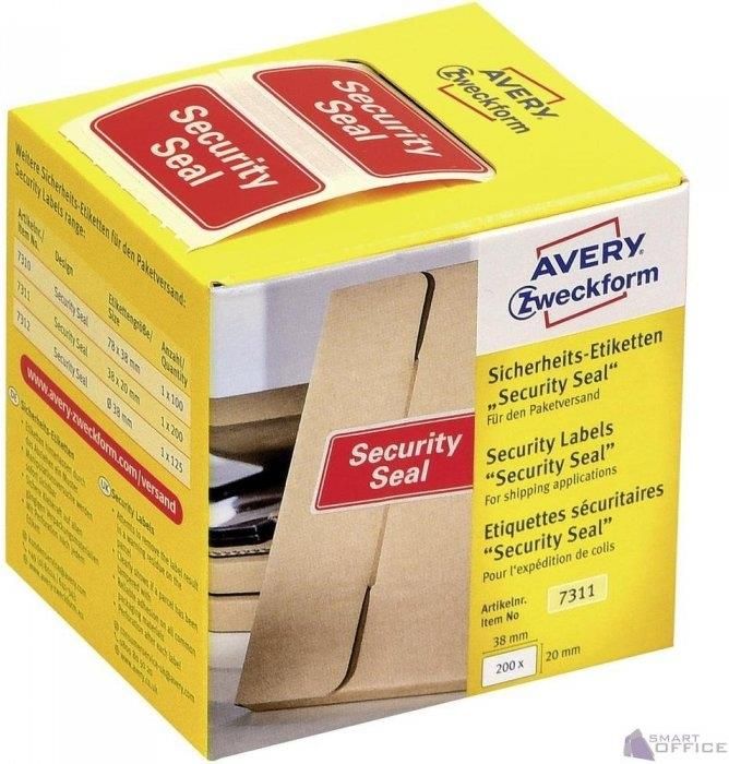 Plomba zabezpieczająca AVERY Zweckform VOID 7311 (świecąca na czerwono, 38 x 20 mm, 200 sztuk na rolce) w kartonowym dyspenserzeEtykiety zabezpieczające "Security Seal" do odczytu na całym świeciePróby naruszenia plomby zabezpieczającej są natychmiast widoczneBezpieczna przyczepność do wszystkich popularnych materiałów opakowaniowych/materiałów wysyłkowychŁatwe i szybkie odrywanie i naklejanie dzięki perforacjiPraktyczny kartonowy dyspenser dla lepszej obsługi i łatwiejszego przechowywaniaOpisy produktówWstępnie zadrukowane plomby zabezpieczające 7311 z wyraźnie rozpoznawalnym i zrozumiałym na całym świecie nadrukiem "Security Seal" w formacie 38x20 firmy AVERY ZWECKFORM są idealne do natychmiastowego uwidocznienia wszelkich prób manipulacji przy użyciu plomby VOID. 200 plomb zabezpieczających na rolce w praktycznym kartonowym dyspenserze. Plomby zabezpieczające pozostawiają napis VOID na wysyłanych towarach. Dzięki specjalnie opracowanemu klejowi plomby zabezpieczające przylegają bezpiecznie i niezawodnie do wszystkich standardowych materiałów opakowaniowych. Plomby zabezpieczające mają również perforację po każdej etykiecie, dzięki czemu są łatwiejsze i szybsze w użyciu, idealne dla większych stacji wysyłkowych. Plomby zabezpieczające w dozowniku kartonów imponują elastycznością i większą wygodą. Zaufaj sprawdzonej jakości marki Avery Zweckform w zakresie etykiet ostrzegawczych.Rozwiązania do etykietowania przesyłekPlomby zabezpieczająceNowy, wydajny i atrakcyjny cenowo asortyment etykiet od Avery Zweckform dla Twoich potrzeb wysyłkowych. Avery Zweckform oferuje teraz wszystkie ważne etykiety wysyłkowe do wysyłki paczek w sprawdzonej jakości marki. Oferta obejmuje etykiety wysyłkowe do zadrukowania w atrakcyjnych cenowo opakowaniach zbiorczych, etykiety ostrzegawcze do prawidłowego etykietowania paczek lub etykiety zabezpieczające do wysyłki wrażliwych produktów/dokumentów. Idealne dla firm wysyłających duże ilości przesyłek.Etykiety wysyłkowena arkuszach A4 w atrakcyjnych cenowo opakowaniach zbiorczychEtykiety ostrzegawczew praktycznym kartonowym dyspenserzeEtykiety zabezpieczające przed manipulacją Plombabezpieczeństwa "Security Seal- wyraźnie rozpoznawalny i zrozumiały na całym świecie nadruk "Security Seal"- na rolce w praktycznym kartonowym dyspenserze- pozostawia napis VOID na wysyłanych towarach- bezpieczne i niezawodne przyleganie do wszystkich standardowych materiałów opakowaniowych- Perforacja po każdej etykiecie dla szybkiego i łatwego przetwarzania- idealne dla większych centrów wysyłkowychPrzykłady zastosowań:- idealne do natychmiastowego uwidocznienia prób manipulacji za pomocą etykiety VOID- do wysyłania cennych lub poufnych danych Avery 7311, Kolor produktu: Czerwony, Typ etykiety: Samoprzylepna etykieta do drukarki, Materiał: Folia. Nie zawiera: PVC. Szerokość etykiety: 3,8 cm, Wysokość etykiety: 2 cm. Naklejki w zestawie: 200 sztuk, Etykiety na rolce: 200 sztuk