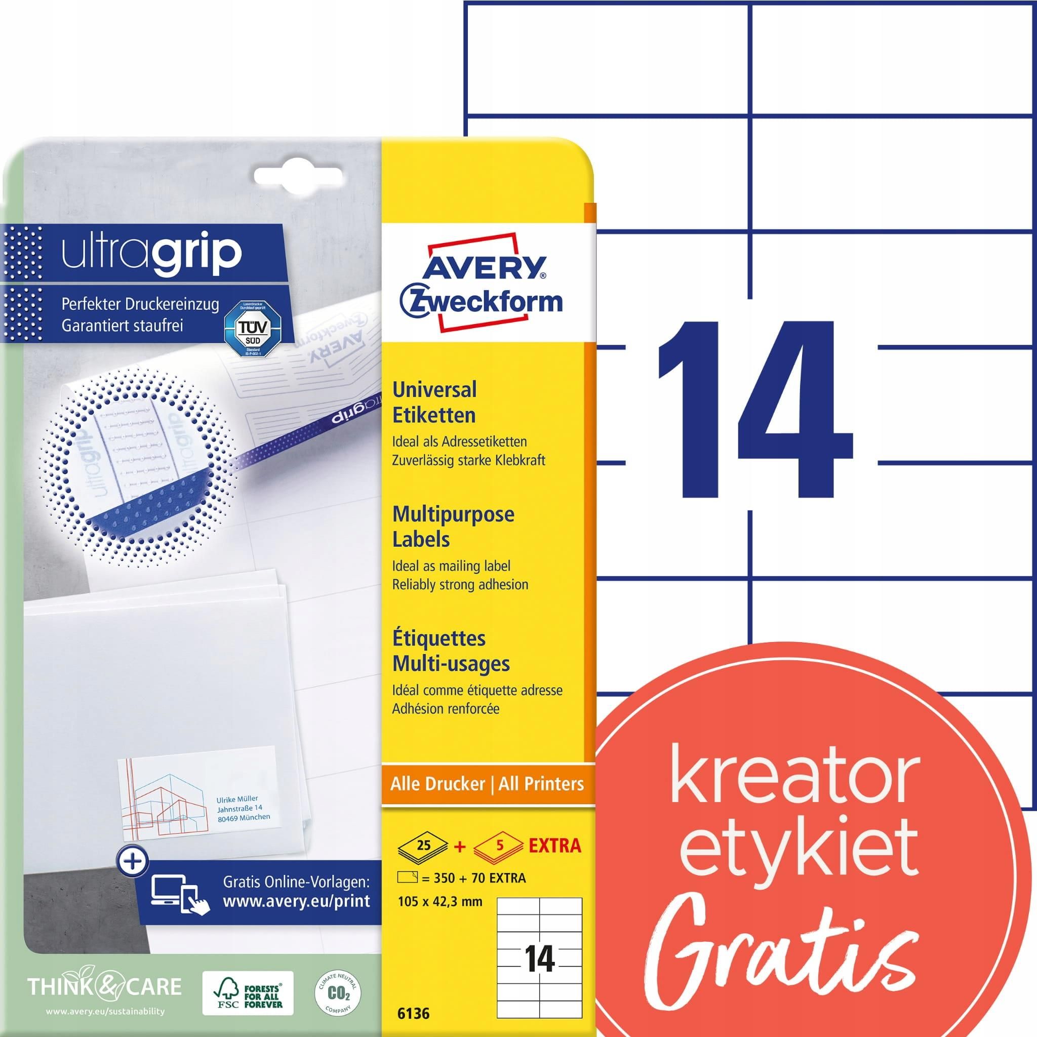 Etykiety Uniwersalne Ultragrip, 105 x 42,3 mm, atramentowe, laserowe, kolorowe laserowe, A4 Najwyższa jakość od eksperta: Białe etykiety uniwersalne 6136 w rozmiarze 105 x 42,3 mm od Avery Zweckform przyklejają się w sposób absolutnie niezawodny i trwały do papieru, kartonu, szkła i wielu standardowych materiałów syntetycznych. Nasze etykiety (350 etykiet/paczkę + 70 etykiet EXTRA) to najwyższej jakości rozwiązanie do etykietowania plików, dokumentów i wielu innych zastosowań w biurze lub do pracy w domu i prywatnie. Ultragrip: zapewnia ultra-wydajność: innowacyjna technologia ultragrip z zauważalnym wzorem na arkuszach etykiet zapewnia ultra-precyzyjną i absolutnie bezzakłóceniową pracę drukarki. Regularnie testowane i potwierdzane przez TÜV Süd dla drukarek laserowych. Idealny również do korespondencji seryjnej i większych nakładów. Nadaje się do wszystkich standardowych drukarek laserowych i atramentowych. Umożliwia to wydajną i bezstresową pracę oraz zapewnia wolny czas na naprawdę ważne rzeczy. Białe etykiety papierowe o niezawodnej przyczepności Precyzyjne podawanie do drukarki i idealne prowadzenie papieru bez zacięć dzięki ultragrip. Projektowanie i drukowanie etykiet samoprzylepnych z pomocą naszego darmowego oprogramowania Certyfikat FSC: wierzchni materiał etykiety jest wykonany z papieru pochodzącego z odpowiedzialnie zarządzanych lasów i może być poddany recyklingowi Więcej w paczce: 5 ARKUSZY EXTRA Idealne do oznaczania zawartości, np. w szafkach, szufladach i pudełkach. EAN: 4004182061367