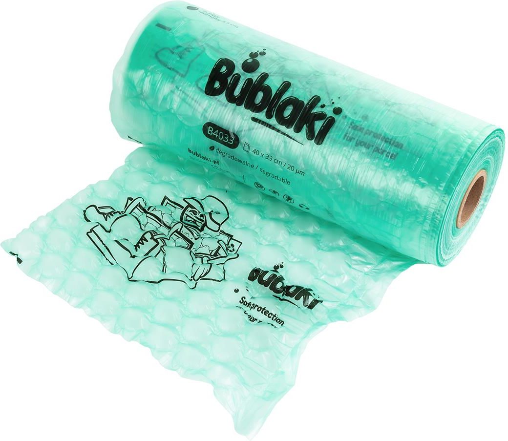 Bublaki zielone 40 x 33 cm to degradowalne wypełniacze paczek, które gwarantują niezawodną ochronę produktów Towary przed wysyłką należy odpowiednio zabezpieczyć tak, aby podczas transportu nie uległy nawet najmniejszym uszkodzeniom. Dobrze przygotowana paczka w oczach klienta świadczy o naszym profesjonalnym podejściu. Maty powietrzne Bublaki to świetny, funkcjonalny system wypełnień, zapewniający ochronę zawartościom przesyłek nawet w trudnych warunkach. Niezawodna ochrona transportowanych przedmiotów Zielone maty powietrzne Bublaki B4033ECO zabezpieczają towary poprzez ich owinięcie oraz dodatkowo wypełniają puste przestrzenie pozostające w paczce, co sprawia, że zawartość nie przemieszcza się podczas transportu. Dzięki swojej wytrzymałości i prostej konstrukcji gwarantują niezawodną ochronę produktów zarówno tych lekkich, jak i średnio ciężkich. Można nimi wypełnić różnorodne towary - począwszy od leków, kosmetyków, przez produkty podatne na uszkodzenia, np. szkło, aż po elektronikę. Zabezpieczają niezależnie od temperatury oraz poziomu wilgotności. Odporność mat na obciążenie przekłada się na doskonałą amortyzację - redukują do minimum wstrząsy, uderzenia, a nawet hałasy. Podział na mniejsze komory powietrzne typu "Bubble" (bąble - (3,5 cm średnica pojedynczego bąbla)) sprawia , że mata jest jeszcze bardziej elastyczna, co pozwala na dokładne owinięcie i dopasowanie się do przedmiotu, który chronią. Ogranicz koszty transportu i magazynowania Powietrzny wypełniacz paczek Bublaki 40x33 cm przed napompowaniem zajmuje bardzo mało miejsca. Pozbawiony powietrza jest płaski, niczym papier, kompaktowy oraz nawinięty na rolkę, co pozwala ograniczyć koszty magazynowania. Wypełniacze powietrzne są produkowane bezpośrednio na stanowisku pakowania w ilości, jaka obecnie jest potrzebna. Maszyna do produkcji Bublaków jest kompaktowa i może być zainstalowana bezpośrednio przy strefie pakowacza. Wypełniacze powietrzne nie wpływają na wagę przesyłki, gdyż składają się z około 95% z powietrza i tylko 5% z folii. Jest to najlżejszy wypełniacz do kartonów dostępny na rynku. Więcej zadowolonych klientów z Bublakami Maty powietrzne są idealnym środkiem dla każdego przedsiębiorcy, który ceni wygodę, oszczędność, jakość oraz wizerunek. Bublaki to wypełniacz paczek do owijania narażonych przedmiotów w trakcie transportu, cieszący się uznaniem nawet najbardziej wymagających konsumentów, zwłaszcza tych, którzy stawiają na rozwiązania ekologiczne. Stosując wypełniacze powietrzne, skutecznie zredukujesz ilość reklamacji, zwiększając tym sposobem satysfakcję wśród klientów. Odpowiednio przygotowane i zabezpieczone paczki z wykorzystaniem wytrzymałych wypełniaczy świadczą o naszym profesjonalizmie, co pozytywnie wpłynie na wizerunek firmy. Degradowalne wypełniacze do paczek Nie istnieje bardziej ekologiczne rozwiązanie niż zastosowanie wypełniaczy z powietrzem. Bublaki B4033ECO mogą zostać ponownie użyte bądź poddane recyklingowi. Dzięki temu uznaje się je za wariant nie tylko ekonomiczny, ale również ekologiczny. Szybkość i łatwość pakowania Produkt po wypełnieniu powietrzem, od razu jest gotowy do użycia. Do napompowania ich wykorzystuje się jedną z dedykowanych maszyn do produkcji wypełniaczy powietrznych. Są łatwe w użyciu - między każdą z mat znajduje się perforacja, która pozwala na łatwe odrywanie ich między sobą. W ten sposób można dobrać odpowiednią ilość do transportowanego przedmiotu i jego opakowania. Maty powietrzne Bublaki B4033ECO - Najważniejsze cechy Wszystko, co musisz wiedzieć o Bublakach Stabilność towaru podczas transportu Wypełniają puste przestrzenie wewnątrz paczki, aby zapakowany produkt nie przemieszczał się w trakcie transportu Prawdziwy bohater w Twojej paczce Zapewniają ochronę i amortyzację owiniętych przedmiotów w trakcie wysyłki Przyjazne dla środowiska Bublaki mogą zostać wielokrotnie wykorzystane, a także podlegają recyklingowi Oszczędność miejsca i kosztów przesyłki Minimalizują koszty transportu i magazynowania. Bublaki przed napompowaniem nie zajmują wiele miejsca, a ich znikoma waga wpływa na obniżenie kosztów wysyłki Wypełnij i zabezpiecz mnóstwo paczek Rolka o długości 300 m pozwoli na zabezpieczenie wielu towarów Wytrzymałe i solidne Grubość folii wynosi 20 mikronów Materiał Maty powietrzne Bublaki zostały wykonane z degradowalnego zielonego materiału Rozmiar Rozmiar pojedynczej maty wynosi 40x33 cm