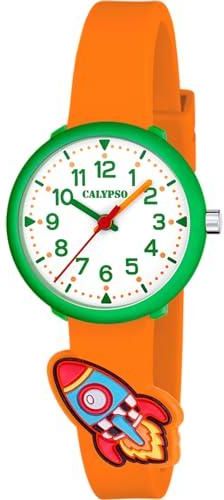Dziecięcy zegarek kwarcowy godziny i minuty. Okrągła gumowa obudowa w wielokolorowym kolorze. Gumowy pasek w kolorze pomarańczowym z zapięciem na klamrę. Biała okrągła tarcza. Wodoodporność: 3 ATM.