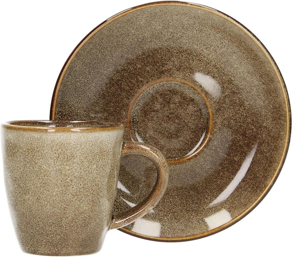 Ceramiczna filiżanka ze spodkiem w kolorze brązowym.Filiżanka z ceramiki Gelato zachwyca minimalistyczną estetyką i subtelną kolorystyką. Lekko nakrapiane, urzekające, wzornictwo, doskonale sprawdzi się podczas serwowania aromatycznej kawy lub ulubionej herbaty. Filiżanka ze spodkiem wspaniale zaprezentuje się w komplecie z innymi naczyniami z serii Gelato. Produkt wykonany ręcznie z efektem szkliwa o nieregularnym kształcie. Możliwe występowanie różnic w wykończeniu oraz kolorze. Nadaje się do mycia w zmywarce i używania w kuchence mikrofalowej.Wymiary: szer. 8 cm, dł. 5,5 cm, wys. 6 cm; spodek: śr. 11 cm, wys. 1,8 cm. Pojemność: 80 ml.