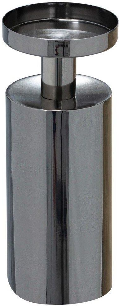 Świecznik glamour z metalu w kolorze czarnym. Elegancki świecznik wykonany z metalu w kolorze czarnym. Błyszcząca powierzchnia pięknie odbija światło, dzięki czemu świecznik efektownie się prezentuje. Umieszczony na komodzie czy stole będzie eleganckim dodatkiem do wnętrz urządzonych w stylu nowoczesnym, glamour czy industrialnym. Skompletuj go z innym świecznikiem tej samej serii. Świecznik przeznaczony na świecę o śr. 7 cm.Wymiary: śr. 8 cm, wys. 20 cm.