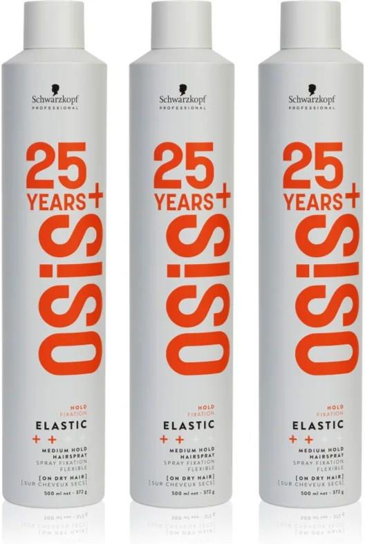 Schwarzkopf Professional Osis+ Elastic, 3x500 ml, Zestawy kosmetyków dla kobiet, Lakier do włosówSchwarzkopf Professional Osis+ Elastic utrwala końcową stylizację włosów oraz przedłuża trwałość fryzury. Sprawi, że fryzura pozostanie nienaruszona przez dłuższy czas, niezależnie od poziomu jej skomplikowania, zapewniając maksymalną kontrolę nad włosami. Będziesz mieć pewność, że każde pasmo pozostanie na swoim miejscu oraz będzie chronione przed działaniami zewnętrznymi, takimi jak wiatr lub wilgoć. Zawartość zestawu: Schwarzkopf Professional Osis+ Elastic spray do włosów o średnim utrwaleniu 3 szt. Właściwości: dokładnie utrwala wszystkie typy włosów i fryzur nie pozostawia resztek we włosach i łatwo się rozczesuje naturalne utrwalenie zapewnia ochronę przed uszkodzeniami termicznymi Sposób użycia: Spryskaj suche włosy z odległości 20–30 cm.