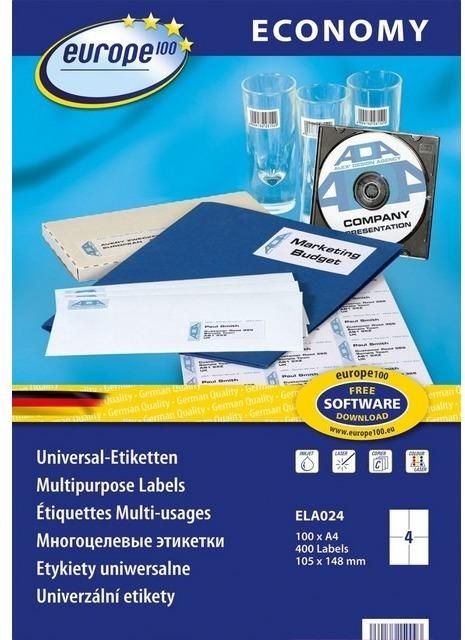 Etykiety samoprzylepne ECONOMY 105x148mm ELA024 AVERY ZWECKFORM Najwyzszej jakości etykiety samoprzylepne do wszechstronnych zastosowan. Przeznaczone do wszystkich typów drukarek atramentowych, laserowych i kserokopiarek. Etykiety posiadają unikalną krawedL QCT, która zapobiega wydostawaniu sie kleju podczas drukowania. Chroni to delikatne elementy drukarki przed uszkodzeniem. Opakowanie zawiera: 100 arkuszy Liczba etykiet na arkuszu: 4 sztuki Wymiary etykiety: 105mm x 148mm 4260167150093