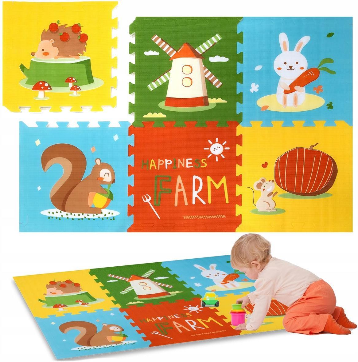 Humbi mata puzzlowa gruba 1,5 cm XXL zwierzątka 6 elementów 165 x 112 cm Piankowa mata powstała przez rozwijającą się markę Humbi. Świetnie sprawdzi się w każdym pomieszczeniu: salonie, pokoju dziecięcym, a nawet na balkonie czy w ogrodzie (w suchą pogodę). Świetna do zabawy, nauki raczkowania, ćwiczeń sensorycznych czy jako mata pod małą zjeżdżalnię. Właściwości piankowej maty puzzlowej: izoluje od chłodu podłogi, amortyzuje ruchy dziecka, łatwa w czyszczeniu - wystarczy przetrzeć ją wilgotną ściereczką, wodoodporna, można ją rozłożyć na gładkich powierzchniach, doskonała do zabaw i ćwiczeń. Idealna do: salonu, pokoju dziecięcego, przedszkola pod tipi, suchy basen z kulkami, kącik sensoryczny raczkowania, gimnastyki, zabawy z rodzeństwem Elementy maty zdobią przyjazne, urocze ilustracje zwierzątek: królika, jeża, wiewiórki i myszki – wszystkie przedstawione w prostym, dziecięcym stylu. Obok nich pojawia się również kolorowy wiatrak oraz pozytywny napis „Happiness Farm”, który dodaje całości uroku. Mata ma antypoślizgową powierzchnię, co zapewnia bezpieczną zabawę. Mata jest wykonana z całkowicie bezpiecznego dla zdrowia dzieci bezzapachowego materiału EPE, który nie zawiera Bisfenolu A (BPA), PVC, ftalanów ani formamidu. Została przebadana i spełnia europejskie normy EN71 dotyczące bezpieczeństwa użytkowania. mata przeznaczona dla dzieci od 2 roku życia wymiary jednego puzzla: ok. 58 x 58 x 1,5 cm wymiary maty: 165 x 112 x 1,5 cm materiał: pianka EPE certyfikat CE puzzle można czyścić mokrą szmatką używanie do czyszczenia produktów z alkoholem może skutkować uszkodzeniem produktu puzzle po wyjęciu z opakowania należy wietrzyć przez 48 godzin warstwa spodnia nie jest użytkowa i dopuszczalne są na niej nierówności, przebarwienia i pory; puzzle są jednostronne wymiary opakowania maty: 60 x 58 x 11,5 cm kod producenta: 9037