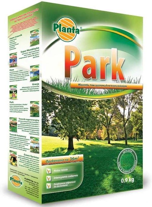 Nasiona trawy Park 0,9kg na tereny zacienione; kod produktu: MG.G957/09 Nasiona trawy Park 0,9kg na tereny zacienione Do miejsc zacienionych: Dedykowana do parków i obszarów rekreacyjnych z ograniczonym dostępem do słońca. Łatwa w utrzymaniu: Niskie wymagania koszenia i podlewania. Zwarty trawnik: Tworzy gęstą darń o intensywnym, zielonym kolorze. Wydajność: Opakowanie 0,9 kg wystarcza na około 36 m². Skład mieszanki Życica trwała (Lolium perenne): 70% Kostrzewa czerwona (Festuca rubra): 20% Kostrzewa szczeciniasta (Festuca trachyphylla): 10% Wybierz nasiona trawy Park Planta i ciesz się pięknym trawnikiem nawet w cieniu!
