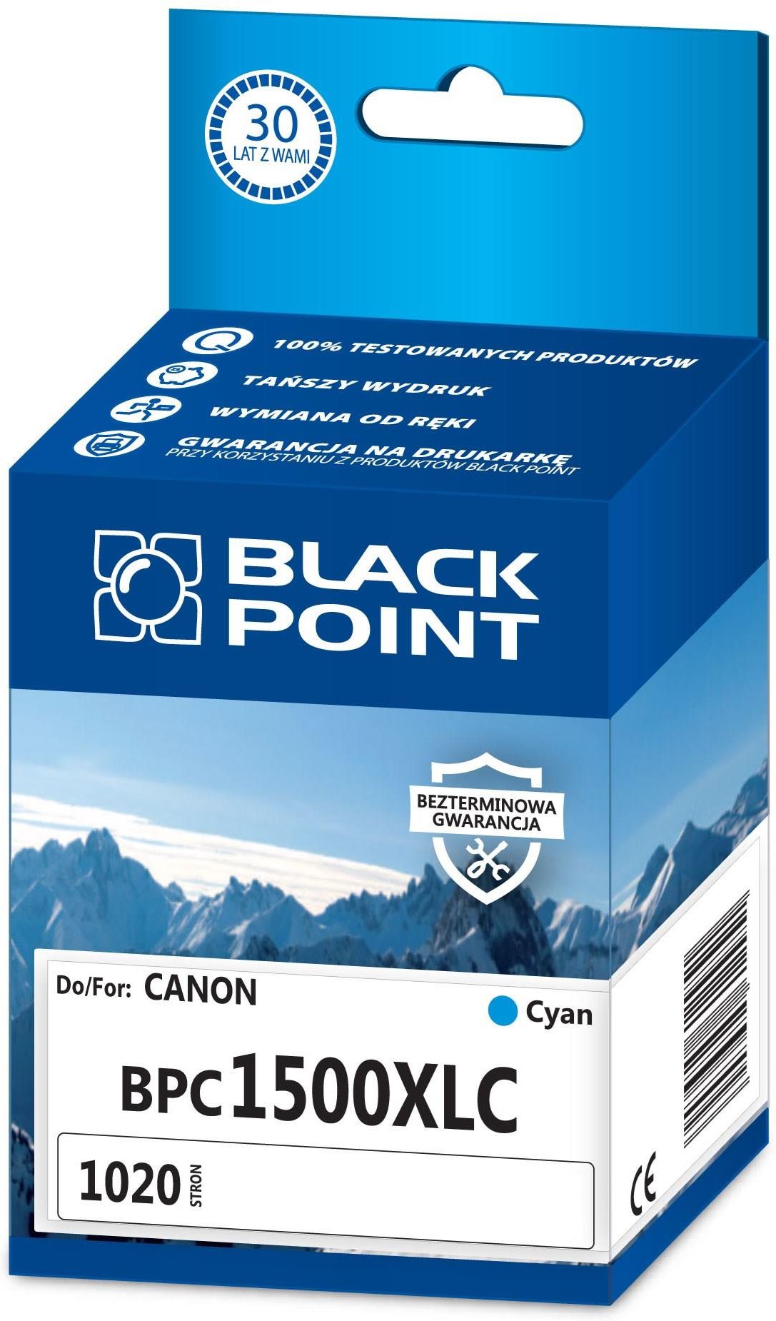 Kartridż atramentowy Black Point BPC1500XLC błękitny cyan Kompatybilność Kartridż atramentowy Black Point BPC1500XLC. Zastepuje Canon PGI-1500XLC. Kolor: cyan. Wydajnosc: 1020 str. (ISO 24711). Kompatybilny z: Canon MAXIFY: MB2050, MB2150, MB2350, MB Gwarancja i Serwis Pragniemy mieć absolutną pewność, że robimy wszystko w kierunku satysfakcji klienta, dlatego też udzielamy na swoje kartridże atramentowe Black Point BPC1500XLC błękitny cyan dożywotniej gwarancji. Innymi słowy, jeśli po zakupie kartridża będzie on używany dopiero kilka tygodni, miesięcy czy lat później, gwarantujemy jego niezmienioną jakość aż do ostatniego wydruku. Jeśli użytkownik nie będzie zadowolony z zakupionego kartridża, może skorzystać z serwisu „door to door” i w ciągu 24 godzin otrzymać nowy produkt. Klientom często towarzyszy obawa, czy stosowanie zamiennych tonerów nie wpłynie na stan ich drukarek. Również w tym przypadku stawiamy na pierwszym miejscu troskę o dobro klienta. Otóż, jeżeli w trakcie użytkowania tonera Black Point, drukarka zostanie uszkodzona, bierzemy całkowitą odpowiedzialność za jej serwis, a na czas naprawy możemy dostarczyć urządzenie zastępcze. Klient może czuć się więc w pełni bezpieczny. Oferujemy także ekstra pół roku gwarancji na drukarkę laserową, ponad czas gwarantowany przez producenta. Dzięki kompleksowym działaniom w trosce o dobro swoich klientów zostaliśmy już trzykrotnie wyróżnieni godłem „Firmy Przyjaznej Klientowi”. Oszczędność Nie tylko jakość i bezpieczeństwo są czynnikami, które mogą przesądzać o zakupie kartridży atramentowych Black Point BPC1500XLC błękitny cyan. Dla klientów jednym z głównych argumentów jest większa ilość wydruków oraz korzystna cena. Większość produktów marki Black Point charakteryzuje się nawet dwukrotnie zwiększoną wydajnością, w porównaniu do kartridży producentów drukarek. Ekologia Stawiamy sobie za cel wspieranie ochrony środowiska, dlatego tak ważna jest dla nas refabrykacja i recykling. Do produkcji kartridży atramentowych Black Point BPC1500XLC błękitny cyan wykorzystujemy puste kartridże, które przeszły pełny proces refabrykacji. Refabrykacja jest procesem proekologicznym. Dzięki wykorzystaniu zużytych kaset pochodzących z recyklingu ograniczamy ilość powstających odpadów.