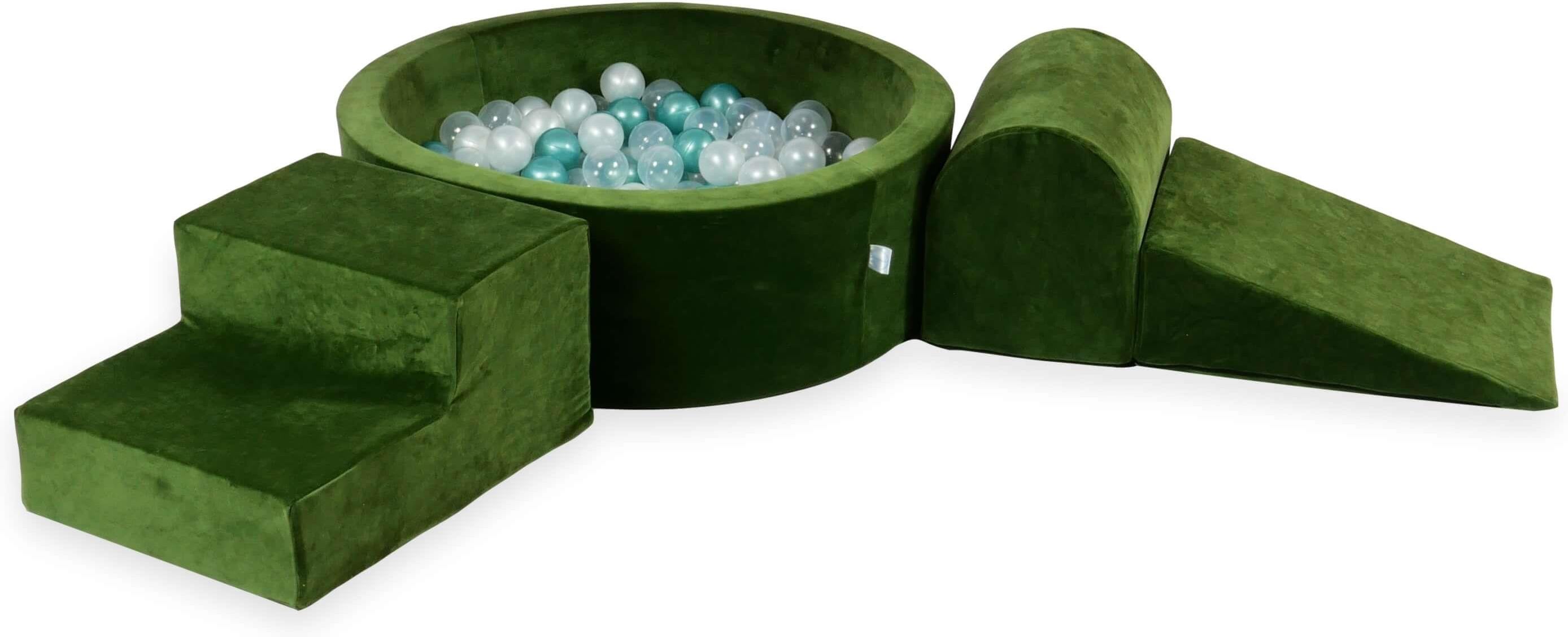 Mimii: Piankowy plac zabaw z basenem okrągłym 90x30 Velvet Soft Oliwkowy + 200 piłek (przezroczyste, perłowe, metaliczny turkus)Piankowy plac zabaw lub jak inaczej nazywany jest - piankowy tor przeszkód to niezwykła frajda dla Twojego malucha. Właściwości: Pozytywnie wpływa na rozwój dziecka Idealnie nadaje się do zabawy (Tylko pod opieką osoby dorosłej) Niezwykła zabawa od pierwszych miesięcy życia Świetnie nadaje się na prezent!Dane techniczne: W całości wykonany z pianki Pokryty pokrowcem wykonanym z przyjemnej w dotyku tkaniny [80% bawełna, 20% poliester] Posiada certyfikat CE oraz certyfikat EN-71 Pokrowiec na zamek, zdejmowany do prania (prać w temperaturze 30 stopni Celsjusza) Produkty pakujemy próżniowo, aby zredukować wielkość paczek. (Po rozpakowaniu produkty potrzebują około 7 dni na osiągnięcie właściwego kształtu)Wymiary elementów (szerokość / długość / wysokość): Schodek: 45/60/30 cm Klin: 45/60/20 cm Górka: 45/30/35 cm Basen okrągły: 90x30 Plastikowe piłeczki do suchego basenu polski producent wykonane z nietoksycznego materiału, bezpieczne dla dzieci bardzo elastyczne, nie ulegają odkształceniu posiadają certyfikat CE średnica piłeczek 7 cmPole 'Plik' Możesz skorzystać z pola 'Plik' oraz załadować plik tekstowy lub graficzny, jeśli chcesz aby wewnątrz paczki znajdowała się wydrukowana kartka z informacją. Mogą to być życzenia lub informacja od kogo jest to prezent. Decyzję zostawiamy Tobie! (Załączanie plików nie jest obowiązkowe) Robimy krok w stronę ekologii! Jako jedni z nielicznych producentów zabawek piankowych wykorzystujemy piankę o podwyższonej gęstości. Dzięki temu, produkty z niej wykonane będą znacznie trwalsze, a co za tym idzie - będą dłużej służyły swoim małym właścicielom! Produkty pakujemy próżniowo, redukujemy dzięki temu wielkość paczek, a to z kolei bezpośrednio przekłada się na wiele korzyści. Dzięki zmniejszaniu wymiarów paczek, zredukowaliśmy również ilość ciężarówek potrzebnych do ich przewiezienia. Do jednej dziennie! Wszystkie kroki, które podjęliśmy przekładają się na mniejsze spalanie paliwa oraz mniejsze zanieczyszczanie środowiska. Uwaga! Kolory przedmiotów na zdjęciach mogą nieznacznie różnić się od rzeczywistych ze względu na różne ustawienia komputera i monitora.
