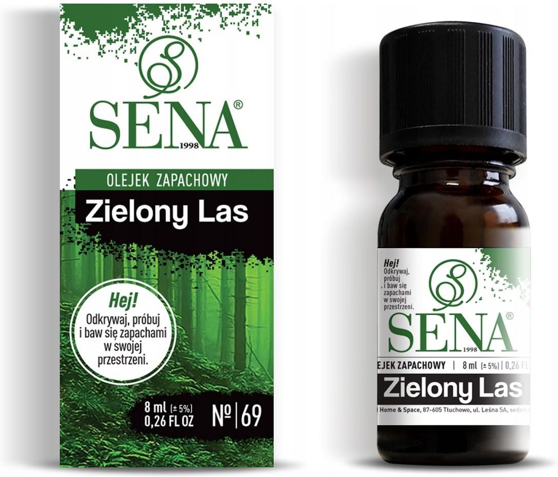 Sena Olejek zapachowy Zielony Las 8 ml Sena Olejek zapachowy Zielony Las Przyjemny, kojący zapach idealnie trafiony w nasze gusta potrafi wprowadzić w dobry nastrój a także zrelaksować i odprężyć . Dlatego oferujemy najwyższej jakości olejki zapachowe na bazie naturalnych olejków eterycznych. Przy ich pomocy wprowadzisz do wnętrza klimatyczny i miły nastrój! Wchodząc do lasu, od razu czujemy niepowtarzalny zapach. Jest to pomieszanie aromatów drzew, krzewów, owoców, kwiatów oraz ziemi. To wszystko sprawia, że w lesie człowiek może odpocząć i oderwać się od codziennej bieganiny. Z myślą o tym, aby przenieść się do lasu nawet w zimowe wieczory, został opracowany olejek Sena o zapachu zielonego lasu. Ta intensywna kompozycja idealnie nada się do odświeżaczy powietrza. Aromat jest intensywny, rześki i orzeźwiający. Sprawdzi się przy sprzątaniu oraz w odświeżaniu ubrań w szafie.