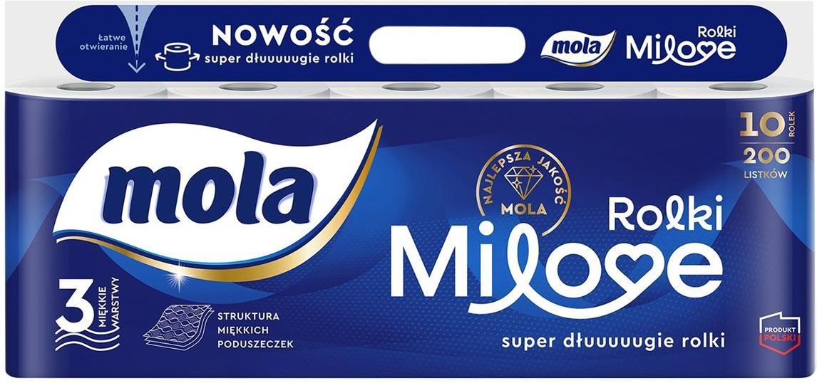 Mola trzywarstwowy papier toaletowy Milove 10 rolek Celuloza Mola to producent papierów toaletowych, chusteczek higienicznych i ręczników papierowych, wśród których znajdą Państwo papier toaletowy Milove.Artykuł ma na celu zapewnić Państwu higieniczną czystość oraz uczucie komfortu podczas załatwiania potrzeb fizjologicznych.Opisywany papier zasługuje na szczególną uwagę ze względu na swoją strukturę, delikatność dla skóry, wydajność i niezwykłą wytrzymałość.Dlatego warto skusić się na jego zakup już dziś! Szczegółowy opis papieru Papier toaletowy Mola Milove: wykonany został z trzech warstw wyselekcjonowanej, czystej celulozy ze względu na długie rolki, wyróżnia się niezwykłą wydajnością i wystarcza na długi czas posiada wyjątkowe tłoczenie 3D w kształcie poduszeczek w technologii Softpillow, co czyni go miękkim i wytrzymałym zapewnia bezpieczeństwo i przyjazność dla skóry i środowiska. Właściwości produktu - Marka: Mola- Linia produktowa: Milove- Materiał wykonania: Celuloza- Kolor papieru: Biały- Ilość warstw: 3- Liczba listków składających się na jedną rolkę: 200- Ilość rolek w opakowaniu: 10.
