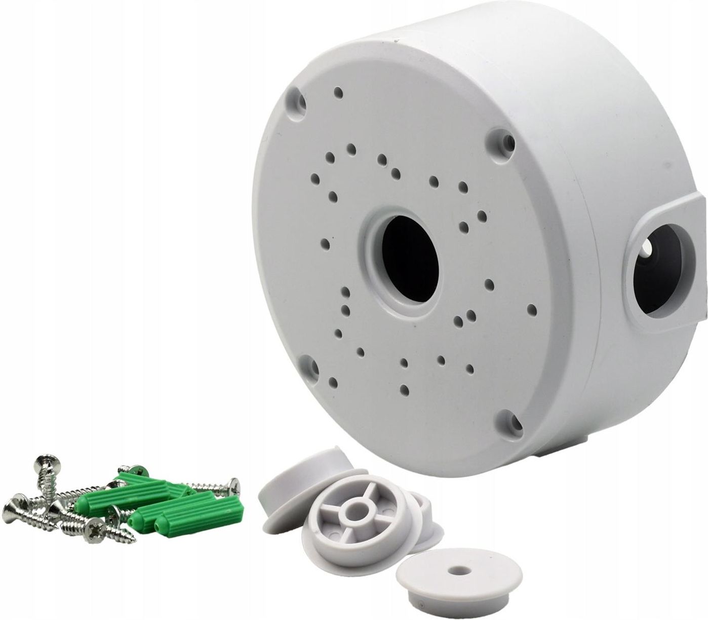 Puszka, uchwyt montażowy do kamer. Universalna. Biała, ABS. Uniwersalna puszka, uchwyt montażowy do kamer dla kamer tubowych i kopułkowych średnica 125mm, dystans 52mm wykonana z plastiku ABS do instalacji na zewnątrz i wewnątrz do instalacji na ścianie, suficie i uchwytach metalowych (np do słupa) trzy otwory dla przewodów, dwa po bokach, jeden z tyłu w zestawie 4 zaślepki, 2 pełne, 2 z otworami na przewody wymiary 125x125x52mm, waga 129g kolor biały w zestawie kołki montażowe Solidna, uniwersalna puszka instalacyjna do kamer. Uniwersalna puszka do kamer tubowych i kopułkowych, do instalacji wewnątrz i na zewnątrz. Wstępnie nawiercone otwory (nie przechodzą na wylot) pasują do prawie wszystkich kamer. Jeżeli zdarzy się że otwory nie będą pasowały, można wywiercić je samodzielnie. Puszka nadaje się do kamer Hikvision, Dahua, Uniview i wielu innych producentów.