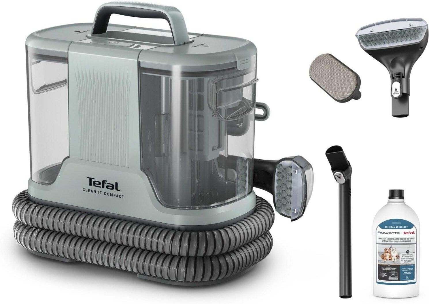 Tefal IZ3020F0 Clean It Compact Idealny odkurzacz do codziennego czyszczenia domu – usuwa plamy po jedzeniu, sierść, błoto i inne zabrudzenia. Niezastąpiony przy zwierzętach i dzieciach. Gwarantuje szybką i skuteczną eliminację bałaganu oraz świeżość każdego dnia. Wielofunkcyjny odkurzacz piorący z dużą mocą ssania Wielofunkcyjny odkurzacz piorący o mocy 400 W i sile ssania do 11,5 kPa łączy aplikację środka czyszczącego z intensywnym czyszczeniem mechanicznym. Skutecznie usuwa zabrudzenia z dywanów, tapicerki i podłóg – idealny do zadań specjalnych w domu.   Wymienne końcówki do każdego rodzaju powierzchni Praktyczne końcówki czyszczące umożliwiają dokładne sprzątanie dywanów, tapicerki, sofy czy wnętrza auta. Dzięki nim z łatwością dotrzesz do trudno dostępnych miejsc i zadbasz o czystość w całym domu i samochodzie. Detergent do plam po zwierzętach – skuteczny i odświeżający Specjalny środek do usuwania zabrudzeń po zwierzętach – wystarczy rozpylić go na plamę, by szybko ją wyczyścić. Skutecznie eliminuje nieprzyjemne zapachy, pozostawiając świeżość i czystość w Twoim domu. Duże, wyjmowane zbiorniki na czystą i brudną wodę Odkurzacz piorący z dużym zbiornikiem na czystą wodę (1,4L) i brudną wodę (0,85L) pozwala na dłuższe sprzątanie bez konieczności opróżniania. Łatwe wyjmowanie i czyszczenie zbiorników zapewnia komfort i oszczędność czasu przy każdym użyciu. Duży zasięg pracy – czystość w każdym zakamarku Długi przewód (4 m) i elastyczny wąż (1,65 m) gwarantują swobodę ruchów i łatwy dostęp do trudno dostępnych miejsc. Bez problemu posprzątasz każdy kąt, a kompaktowa konstrukcja ułatwia przechowywanie urządzenia po zakończonej pracy. Funkcja samoczyszczenia – higiena i wygoda Odkurzacz wyposażony w system samoczyszczenia – wystarczy podłączyć specjalne akcesorium, by szybko przepłukać wąż po użyciu. To proste rozwiązanie ułatwia codzienną konserwację i zapewnia długotrwałą czystość urządzenia.
