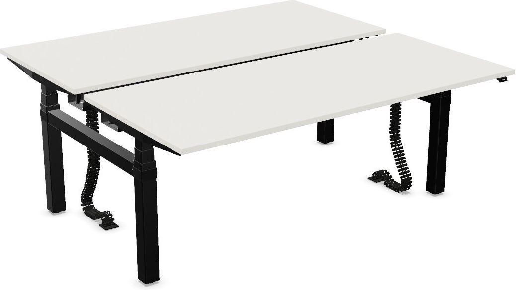 Nowoczesne, ergonomiczne i praktyczne stanowisko workbench dla dwóch użytkowników z elektryczną regulacją wysokości eModel 2.0 H-LEG M RC na podstawie typu "H" firmy Nowy Styl. Elektryczna regulacja wysokości biurka przy pomocy przycisków lub panelu sterowania. Dwa blaty wykonane z płyty melaminowej o wymiarach 180x80 cm, grubość 25 mm. Blaty przesuwne. Kilkanaście kolorów do wyboru, dodatkowo obrzeże blatu może być w innym kolorze. Podstawa typu "H" trzysegmentowa wykonana z metalu - cztery kolory do wyboru.
