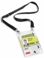 10 x IDENTYFIKATOR HOLDER A6 Z TAŚMĄ TEKSTYLNĄ SMYCZ Durable Durable Identyfikator na smyczy zapewniający łatwa identyfikacje osób podczas szkoleń, konferencji czy prelekcji. Otwieranie od góry umożliwia szybka i łatwa wymianę etykiety opisowej. Taśma tekstylna o szerokości 20mm, zaopatrzona w dwa zapięcia typu karabińczyk jest prosta do przymocowania. Jej dodatkowym atutem jest zamek wypinający , który umożliwia odczepienie taśmy w razie jej nagłego pociągnięcia. Długość taśmy 88cm pozwala na wygodę i komfort użytkowania. Dodatkowa kieszeń na odwrocie identyfikatora umożliwa umieszczenie wizytówki. ilość sztuk w opakowaniu: 10 szt. jednostka sprzedaży: opak klips: nie kolor: przezroczysty rodzaj: z taśmą rodzaj mocowania: metalowe zapięcie typu karabińczyk rodzaj tworzywa: folia PP wymiary wewnętrzne: 105x148mm klasa produktu: Standard