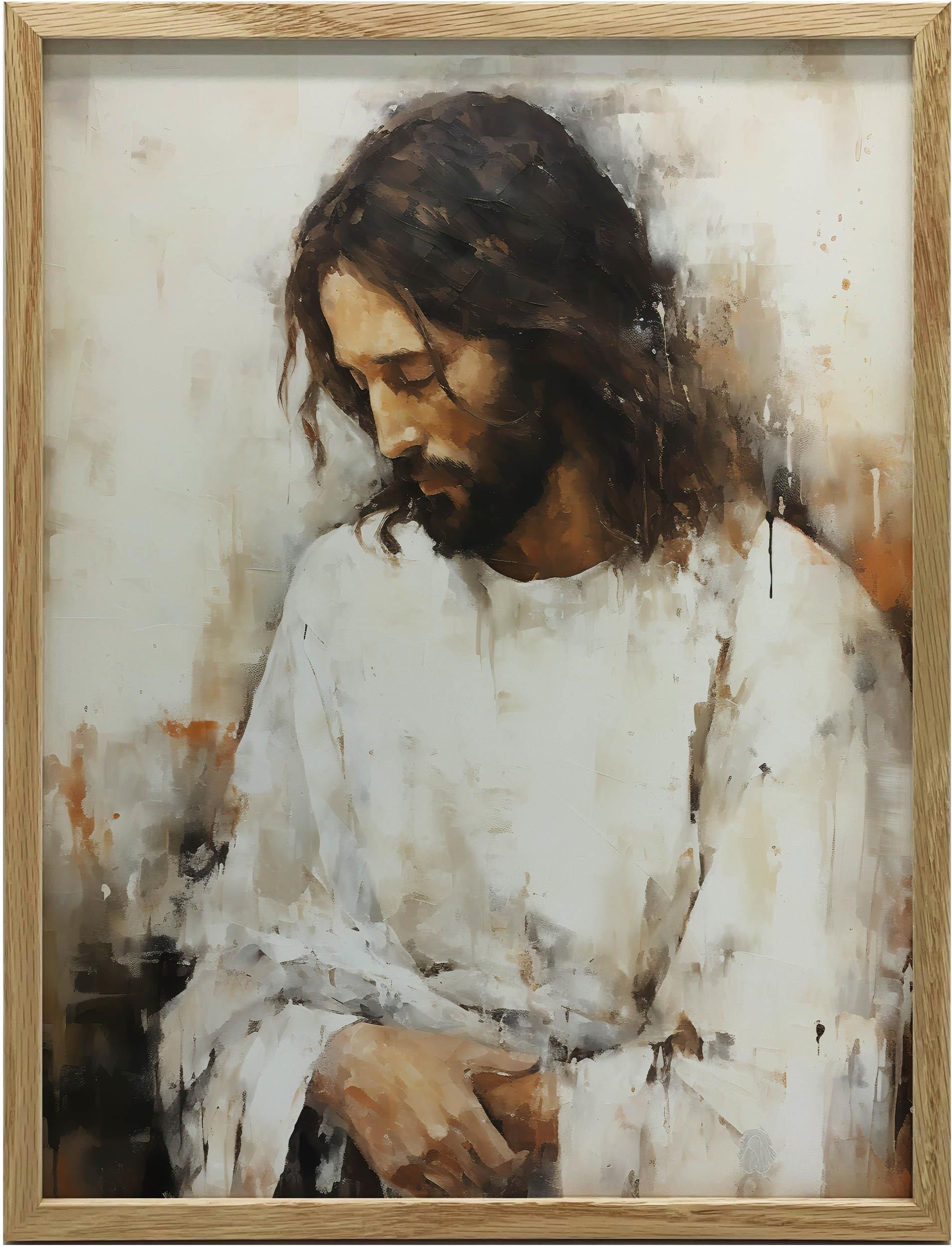 Plakat przedstawia serene atmosferę obecności Boga, ukazując Jezusa w białej szacie, emanującego spokojem. Jego twarz wyraża radość oraz głęboki spokój, co daje poczucie bezpieczeństwa. Abstrakcyjne tło jest ozdobione delikatnymi kolorami, a subtelne pociągnięcia pędzla potęgują uczucie harmonii i …