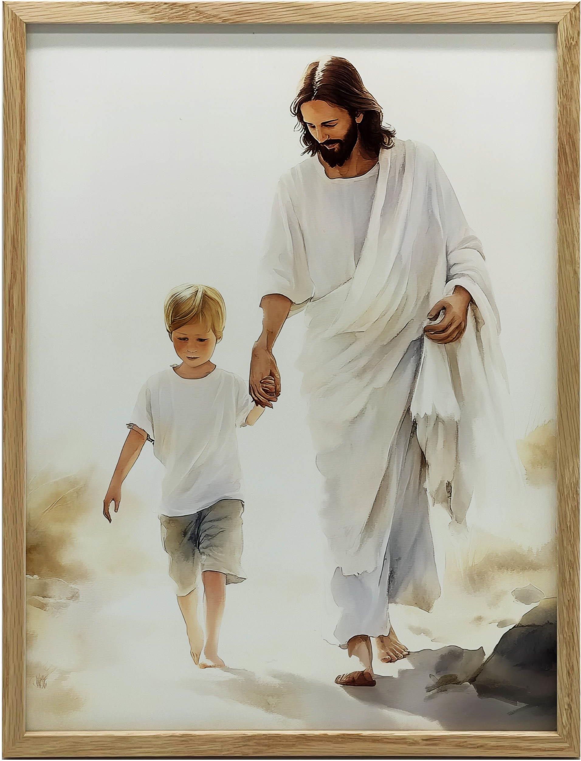 Plakat zatytułowany „Wspólna Droga z Jezusem” to poruszająca ilustracja, na której Jezus trzyma za rękę młodego chłopca. Jego biała szata oraz stonowane tło nadają całości ciepły i spokojny nastrój. To doskonały prezent dla dziecka z okazji Pierwszej Komunii Świętej, urodzin czy innych istotnych …