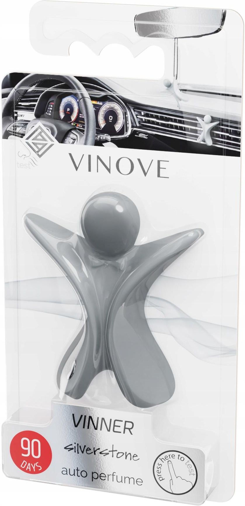 VINOVE SILVERSTONE Perfumy męskie do samochodu 90 dni VINOVE – EKSKLUZYWNE PERFUMY SAMOCHODOWE Nowa marka perfum samochodowych, stworzona przez polskich pasjonatów we współpracy z francuskimi mistrzami sztuki perfumeryjnej i włoskimi projektantami oraz naukowcami. Do ich stworzenia zastosowano technologię XXI wieku. Wykorzystując wiedzę, otwartość i doświadczenie zespołu naukowców i wspólnie z nimi udało się skondensować zapachy w nowatorskim polimerze. Nadano mu taki kształt, by powietrze z wywietrzników samochodowych delikatnie opływało polimerowy labirynt, uwalniając zapach subtelnie i długotrwale – aż do 90 dni. Silverstone to kwintesencja męskiej rywalizacji. Zapach liderów i pretendentów do podium. Działa elektryzująco. Na starcie zaskakuje świeżością cytryny i ziół z lawendą. Rozpędza się nutami drzewnymi z pomarańczowym turbodoładowaniem. Finiszuje piżmem i mocą paczuli. Silverstone to zapach zwycięzców. ✔️Nuta głowy: cytryna, zioła, lawenda ✔️Nuta serca: nuty drzewne z dominacją cedru, kwiat pomarańczy ✔️Nuta bazowa: piżmo i nuty pudrowe z akcentem paczuli Vinove Vinner ✔️Polimer odporny na wysokie temperatury – gwarancja zachowania koloru na dłużej. ✔️Detal w postaci metalizowanej wpinki z logo. ✔️Udoskonalona formuła polimeru dłużej utrzymująca zapach, dłuższe i bardziej intensywne uwalnianie zapachu. ✔️Idealnie zaprojektowany klips, chowany w polimerze. Vinove Vinner można użyć na dwa sposoby: zawiesić np. na lusterku lub zamontować na kratce wentylacyjnej. W zestawie znajduje się sznureczek. Wymyślone we Francji. Zaprojektowane we Włoszech. Wyprodukowane w Polsce BEZPIECZEŃSTWO Bezpieczeństwo dla kokpitu i tapicerki. Perfumy samochodowe VINOVE ujęte są w całkowicie bezpiecznym dla wnętrza samochodu trwałym polimerze, stanowiącym wraz z obudową kondensator zapachu. Testy wykazały pełną odporność tych perfum na wysokie i niskie temperatury. Żaden z komponentów użytych w perfumach VINOVE nie wchodzi w szkodliwe reakcje z materiałami używanymi we wnętrzach aut. Kondensator zapachu VINOVE ma postać stałą, dzięki czemu nie wydostanie się z niego żadna substancja – wyłącznie wyjątkowy zapach. WŁOSKI DESIGN Szlachetna forma perfum samochodowych VINOVE idealnie wpisuje się w stylistykę współczesnych aut. UNIKALNOŚĆ ZAPACHU Francuski rodowód receptur perfum VINOVE zapewnia wyszukane połączenia nut zapachowych. Twój samochód zyska dodatkowy wymiar elegancji. Trwałość zapachu Perfumy samochodowe VINOVE pachną aż do 90 dni. Dyskretny zapach uwalnia się powoli dzięki skoncentrowanym esencjom zapachowym i zaawansowanym technologicznie polimerom, użytym jako nośnik zapachu.