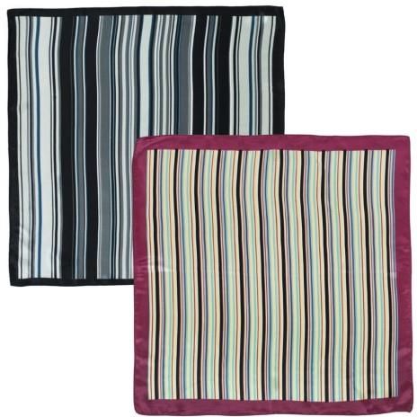 Kolorowa apaszka / gawroszka z satynowym połyskiem. Uniwersalny dodatek urozmaicający i ożywiający stylizację. Wzór: paseczki w dwóch opcjach: 1. brzeg czarny 2. brzeg bordowy Materiał: poliester Wymiary: 50 x 50 cm