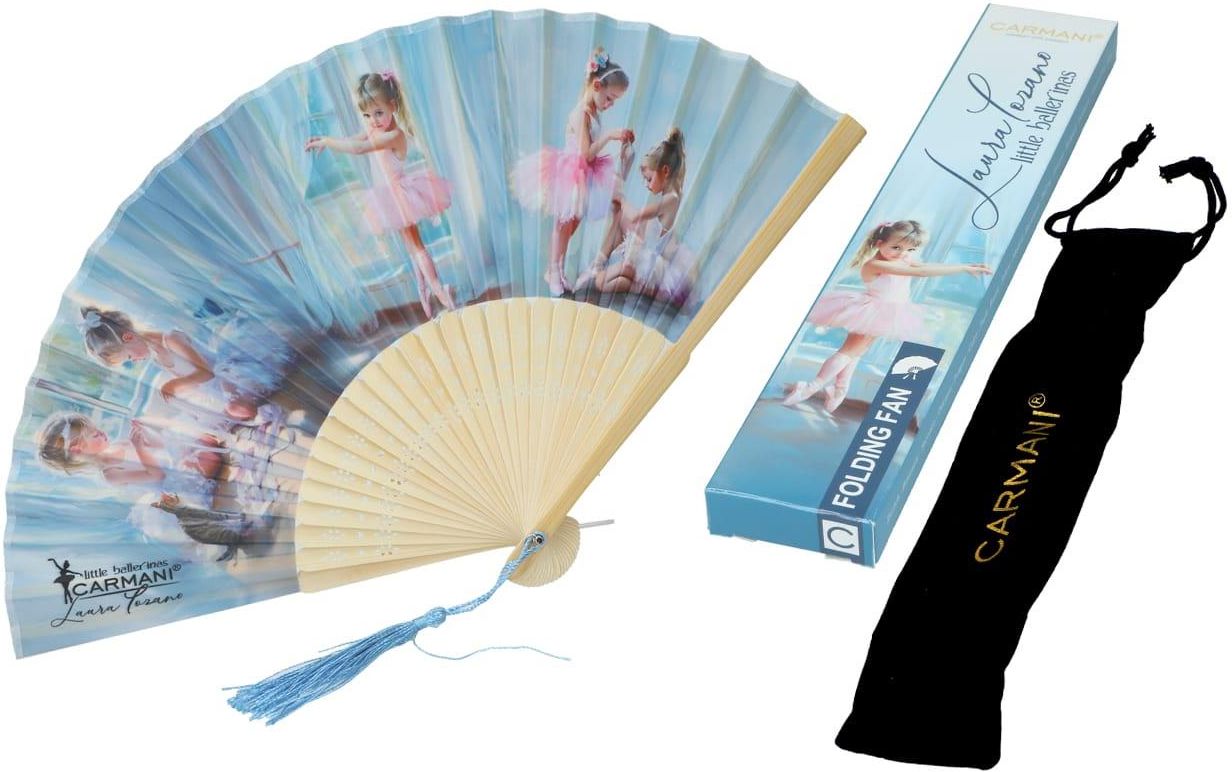 Wachlarz z pięknym motywem artystycznym idealnie sprawdzi się jako elegancki dodatek na upalne dni. Wachlarz wykonany jest z poliestru i bambusowych listeweczek, dodatkowo ozdobiony chwostem. Posiada aksamitne etui, dzięki czemu jest doskonale zabezpieczony w torebce. Wachlarz jest zapakowany w kolorowe pudełko i jest świetnym pomysłem na gustowny upominek. Motyw: Laura Lozano "Małe baletnice" w odcieniu błękitnym Wymiary: długość złożonego 20 cm, szerokość po rozłożeniu 38 cm