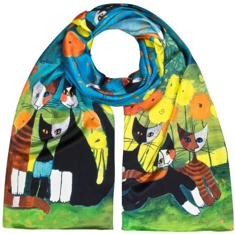 Piękny jedwabny szal z barwnym motywem artystycznym - charakterystyczne koty Rosiny Wachtmeister przyciągają uwagę swoim intrygującym wyglądem. Produkt premium marki Von Lilienfeld. Brzeg szala jest ręcznie walcowany, co wygląda lepiej jakościowo niż brzeg szyty. Świetnie wybarwiony obraz na szalu …
