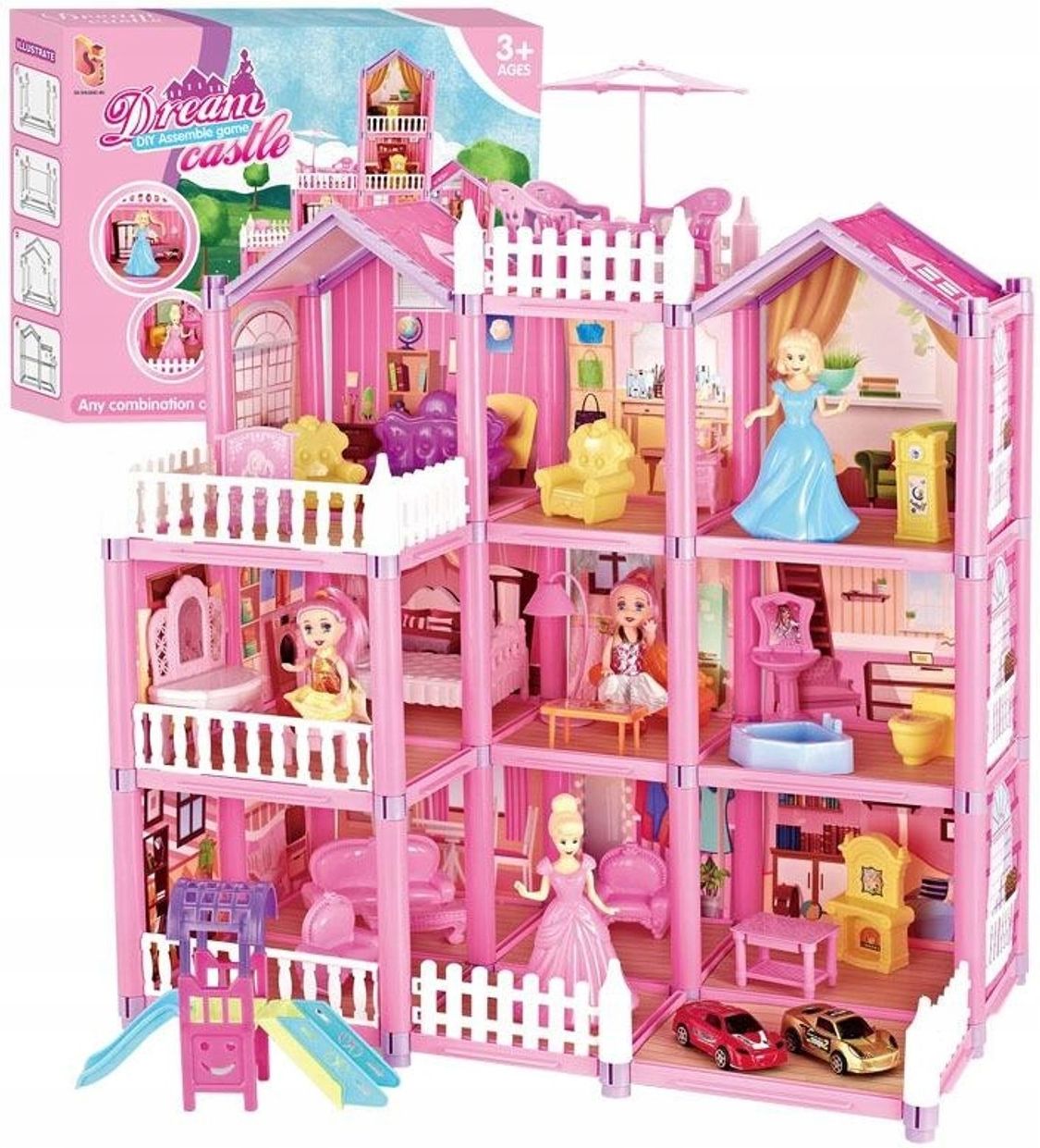 DOMEK DLA LALEK 4 LALKI 2 SAMOCHODY MEBLE 222 ELEMENTY DUŻY WYMARZONY DOMEK DLA LALEK Duży, piętrowy domek dla lalek to spełnienie marzeń każdej dziewczynki. Składa się z 3 kondygnacji, 9 pomieszczeń oraz 3 tarasów, które będziesz mogła dowolnie zaaranżować oraz udekorować mebelkami z zestawu. Idealne odzwierciedlenie prawdziwego domu Brak ostrych i niebezpiecznych krawędzi Dla dzieci powyżej 3 roku życia Zabawa, która nie ma końca! Duży zestaw aż 222 elementy 4 laleczki (ruchome rączki i nóżki, zdejmowane buciki) 9 wyróżniających się pomieszczeń 3 niezależne poziomy do zabawy 3 tarasy Wiele kombinacji układania domku (piętrowa lub parterowa) Niezbędne meble do wyposażenia domku Dwustronna zjeżdżalnia Duży parasol na taras 2 samochody Kompletny zestaw to najlepszy prezent jaki możesz sprawić swojemu dziecku. Gotowy do zabawy już po złożeniu. Dowolna aranżacja Każde pomieszczenie wykończono w innej stylistyce, dopasowując wystrój oraz meble do charakteru i przeznaczenia danego pokoju. Nic jednak nie stoi na przeszkodzie aby Twoje dziecko bawiło się w projektanta wnętrz i urządziło je po swojemu. Rozwój dziecka Wykorzystując większość przedmiotów codziennego użytku domowego, dziecko uczy się kreatywności. Może również zaprosić do zabawy rówieśników, lub rodziców przez co uczy się zachowań społecznych poprzez śmiech i zabawę. Kreatywność Wspólna zabawa doskonale pobudza wyobraźnię, zachęca do kreatywnego i nieszablonowego myślenia, a także doskonale rozwija zdolności manualne u najmłodszych. Brak ostrych krawędzi Nasz domek jest w pełni bezpieczny. Projektanci zaprojektowali domek tak, aby Twojemu dziecku nie stała się krzywda. Dwustronna zjeżdżalnia Kolorowa zjeżdżalnia dostarczy dodatkowej zabawy. Można ją postawić w dowolnym miejscu w domku lub poza nim. Ruchome laleczki Zestaw zawiera dwie laleczki. Każda z nich ma osobną stylizację więc mogą odgrywać inne role podczas zabawy. Dodatkowo mają możliwość ruchów rączkami oraz nóżkami. Można je zginać i sadzać na krzesełkach czy sofie. Dodatkowym atutem jest gumowa głowa oraz włosy, które można czesać (brak szczotki w zestawie). Akcesoria wyposażenia Nasz domek posiada dodatkowe akcesoria wyposażenia: fotele do salonu (element dekoracyjny) sofa (element dekoracyjny) komodaz telefonem (element dekoracyjny) Ława (element dekoracyjny) lampka stojąca (element dekoracyjny) Duże fotele na taras/kuchenne (możliwość posadzenia laleczek) Duży stół okrągły na taras Duży stół prostokątny do jadalni Duży parasol stojący na taras Parawan Zjeżdżalnia (możliwość posadzenia lub zjechania laleczką) Samochody SPECYFIKACJA PRODUKTU Ilość elementów: 222 sztuk Czas montażu: około 30-60 min Przeznaczenie: od 3 lat Wymiary: 48x28x48 cm ZESTAW ZAWIERA Elementy konstrukcji Ściany,dach Barierki na taras Cztery laleczki Akcesoria wyposażenia Oryginalne opakowanie
