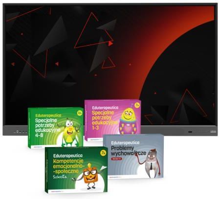 Cena uwzględnia preferencyjną stawkę VAT 0% na niektóre składowe zestawu.Zakup towaru z 0% VAT dostępny dla szkół i placówek oświatowych. Zestaw zawiera: Monitor interaktywny myBoard Grey ROCK 2.0 65" z Androidem 11.0 Eduterapeutica Lux SPE 1-3 Eduterapeutica Lux SPE 4-8 Eduterapeutica Lux Problemy wychowawcze. Zestaw Kompetencje społeczno-emocjonalne Szkoła Dostawa Wybierz najlepsze rozwiązania dla SPE. Nowoczesny sprzęt, narzędzia i programy terapeutyczne spełniające wymogi rozporządzenia – wszystko w jednym zestawie! Do wykorzystania przez nauczycieli, logopedów podczas pracy z dziećmi o specjalnych potrzebach edukacyjnych oraz z dziećmi nie przejawiających tych zaburzeń. 1 x Monitor interaktywny myBoard GREY ROCK 2.0 Android 65" Monitor interaktywny myBoard GREY został w całości przystosowany do obsługi wysokiej rozdzielczości 4K ULTRA HD. Wyposażony w system operacyjny Android 11, posiada również funkcję ScreenShare, czyli udostępnianie wyświetlanego materiału z obustronną interakcją. 1 x Eduterapeutica Lux SPE 1-3 Eduterapeutica Lux Specjalne Potrzeby Edukacyjne 1-3 to zestaw ćwiczeń multimedialnych wraz z kartami pracy do wykorzystania na zajęciach z dziećmi z ryzykiem wystąpienia lub orzeczeniem/opinią o dysleksji, dysgrafii, dysortografii lub dyskalkulii. Materiały zawarte w programie można wykorzystać nie tylko podczas grupowych lub indywidualnych zajęć wyrównawczych, rewalidacyjnych i korekcyjno-kompensacyjnych, ale także w pracy z całą klasą. 1x Eduterapeutica Lux SPE 4-8 Eduterapeutica lux SPE 4-8 to program multimedialny, który wzbudza zainteresowanie uczniów. Motywuje ich do aktywnego udziału w zajęciach terapii pedagogicznej i systematycznego treningu. 1x Eduterapeutica Lux Problemy wychowawcze. Zestaw Zestaw pomocy kompleksowo wspierające szkołę (dyrektora, nauczycieli, wychowawców i specjalistów) oraz rodziców w obszarach z problemami rozwojowymi w zakresie psychologicznym i społecznym uczniów w rożnym wieku. Zestaw „Problemy wychowawcze” pozwala przygotować szkołę podstawową do skutecznego przeciwdziałania przemocy, agresji i uzależnieniom, a także wspierania rodziców i dzieci z problemami emocjonalnymi. 1x Kompetencje społeczno-emocjonalne Szkoła EDUTERAPEUTICA LUX - Kompetencje emocjonalno-społeczne Szkoła to ćwiczenia interaktywne i karty pracy, które pomagają kształtować umiejętności związane z rozpoznawaniem i akceptacją różnych stanów emocjonalnych (swoich i innych), radzenia sobie z trudnymi emocjami, kulturalnego zachowania w sytuacjach społecznych, a dodatkowo wzmacniają myślenie przyczynowo-skutkowe, strategiczne, problemowe i przestrzenne.