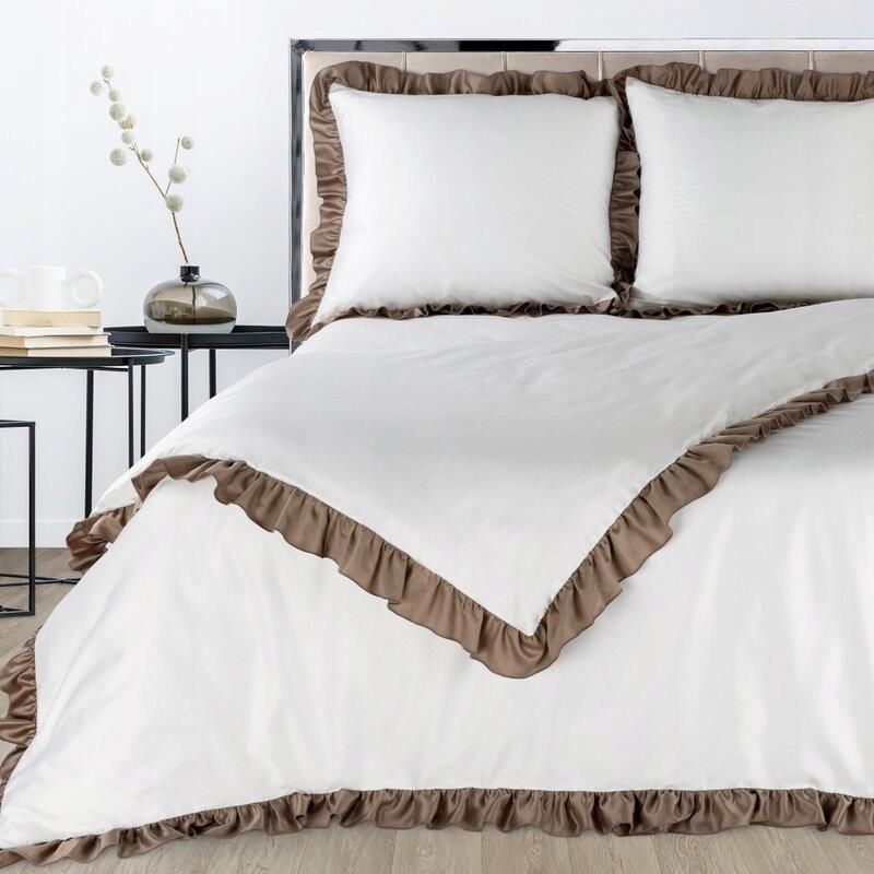 Elegancki biały komplet pościeli satynowej ELIZA wyprodukowany przez firmę Eurofirany. Wykonano go z wysokiej jakości satyny bawełnianej z dodatkiem poliestru, dzięki czemu pościel jest bardziej wytrzymała, sprężysta i aksamitna w dotyku. Prezentowana kolekcja pościeli została zaprojektowana według najnowszych światowych trendów. Kupując ją możesz więc być pewien, że wystrój Twojej sypialni będzie modny i elegancki. Biały komplet pościel, ozdobiony kawową Falbanką na poduszkach i poszwie, prezentuje się niezwykle efektownie, a kontrastowa falbana przełamuje monotonię bieli, i nadaje całości wyjątkowego charakteru. W skład kompletu wchodzą poszwa na kołdrę: 160 x 200 cm - 1 szt. poszewki na poduszki: 70 x 80 cm - 2 szt. Producent: Eurofirany Rozmiar poszwy na kołdrę: 160x200 cm Skład surowcowy: 100% satyna bawełna Sposób zapięcia: zamek błyskawiczny Kolor: biały, ciemnobeżowy Gramatura: 125 GSM Skład: 55% bawełna, 45% poliester