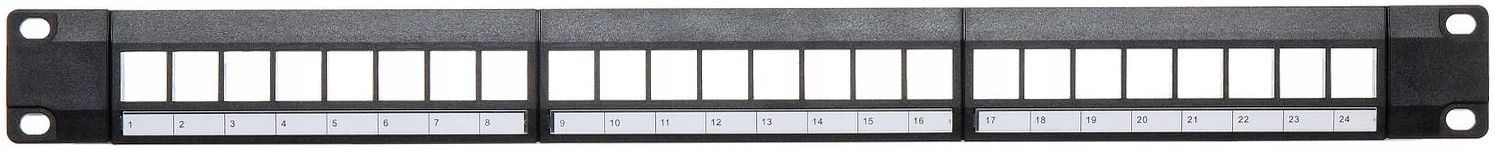 Patch panel do złącz Keystone. Uwaga! Produkt nie współpracuje z FX-RJ45-59B / FX-RJ45-59. SPECYFIKACJA Miejsce na złącza: 24 szt.Panel jest odpowiedni do złącz KEYSTONE o szerokości max. 16.5mm Materiał: Metal / Plastik Kolor: Czarny Zastosowanie: RACK 19", 1U Waga: 0.38 kg Wymiary: 483 x 78 x 44 mm Wybrane cechy Na płytce znajdują się otwory pozwalające zamocować kable za pomocą opasek zaciskowych Pełna nazwa produktu PATCH PANEL KEYSTONE PP-24/FX/C1 DA