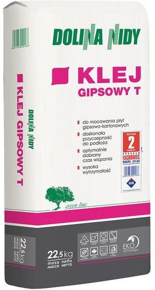 Klej gipsowy T 22.5 kg marki Dolina Nidy. Do przyklejania płyt gipsowo-kartonowych oraz płyt zespolonych do izolacji cieplnej i akustycznej do ścian wewnątrz budynków. Uwaga - na sufitach zalecany jest montaż na ruszcie. Do wypełniania miejscowych ubytków podłoża o głębokości do 20 mm. Do stosowania na podłożach które mogą stanowić powierzchnie z cegieł, bloczków, pustaków lub innych elementów ceramicznych, wapienno-piaskowych, betonu i betonu komórkowego. Główne właściwości kleju: klej gipsowy produkowany na bazie naturalnych spoiw gipsowych uzyskiwanych w wyniku prażenia kamienia gipsowego, zawiera wypełniacze mineralne oraz komponenty powodujące, że masa gipsowa jest plastyczna i bardzo łatwa w obróbce. Bardzo wysoka wytrzymałość połączenia klejowego – zapewnia trwałe i mocne połączenie płyt gipsowo-kartonowych z podłożem. Korzystne parametry robocze - klej jest łatwy do nakładania, a podczas ustawiania i dociskania płyt łatwo dopasowuje się do kształtu i nierówności podłoża. Wydłużony czas wiązania – zapewnia wygodną pracę oraz możliwość swobodnego ustawienia i skorygowania każdej płyty do oczekiwanego położenia końcowego. Niski skurcz po utwardzeniu kleju – brak wewnętrznych odkształceń i naprężeń w warstwie połączenia klejowego zapewnia wysoką stabilność połączenia. Zużycie. Średnio zużywa się ok. 2,5 – 5,0 kg na 1m2, w zależności od stopnia równości podłoża i przyjętej metody klejenia.