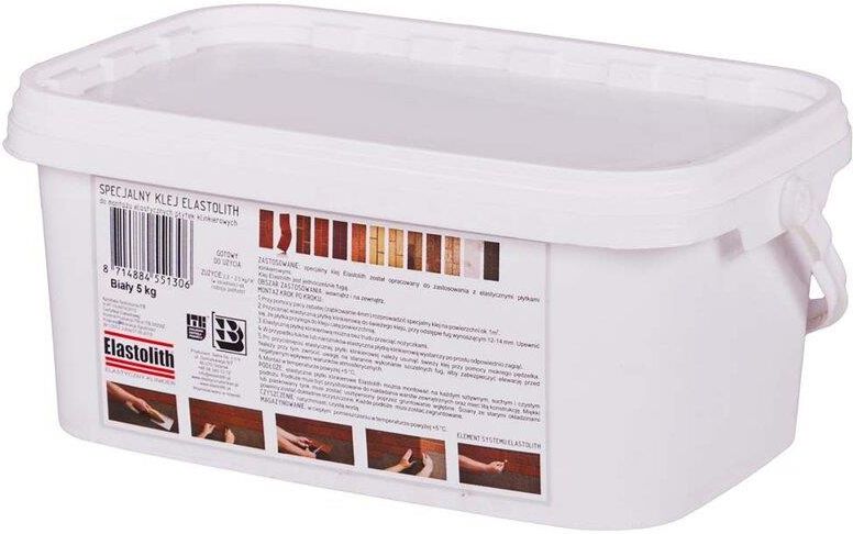 Klej-Fuga w kolorze białym marki Elastolith.Jest to wysokiej jakości klej przeznaczony do klejenia płytek elastycznych.Pełni jednocześnie rolę kleju oraz fugi, co umożliwia jego szerokie zastosowanie.W łatwy sposób pozwala na montaż płytek bez używania specjalistycznych narzędzi.Wystarczy rozprowadzanie kleju poprzez pacę zębatą i wygładzenie fugi wilgotnym pędzelkiem.Zapewnia to odpowiednią przyczepność oraz zabezpiecza płytki przez działaniem warunków atmosferycznych, nadając im jednocześnie elegancki wygląd.Szeroka paleta kolorystyczna pozwala na wybór odpowiedniego koloru, najlepiej pasującego do całej kompozycji.Opakowanie zawiera 5 kg.