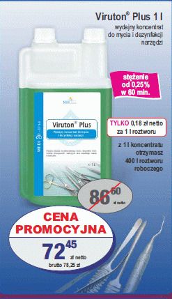 Koncentrat do mycia i dezynfekcji narzędzi Viruton Forte 1l - wydajny koncentrat o wyjątkowych właściwościach czyszczących i wysokiej tolerancji materiałowej. Przeznaczony jest do jednoczesnego mycia i dezynfekcji manualnej , w automatach myjących, a także w myjkach ultradźwiękowych. Zalecany jest do instrumentów chirurgicznych, rotacyjnych oraz wszelkiego rodzaju endoskopów. Viruton Forte posiada bardzo dobre właściwości czyszczące i szerokie spektrum bójcze w krótkim czasie działania. Produkt wykazuje właściwości antykorozyjne i wysoką tolerancję materiałową. Jest zalecany do dezynfekcji instrumentów ze stali szlachetnej, niklu, miedzi, aluminium, gumy, porcelany, szkła i tworzywa sztucznego. Aktywność nieużywanego roztworu roboczego wynosi 14 dni. Skuteczność mikrobiologiczna: Szczegółowe informacje zawarte w ulotce produktowej Sposób użycia: Koncentrat przed użyciem należy rozcieńczyć wodą. Instrumenty bezpośrednio po użyciu zanurzyć w roztworze. Wszystkie części i otwory muszą być całkowicie wypełnione roztworem. Nie łączyć z innymi środkami czyszczącymi lub dezynfekującymi. Przed pierwszym zastosowaniem preparatu Viruton Forte instrumenty należy umyć czystą wodą, aby nie doszło do kontaktu z innymi środkami. Pozostałości innych substancji w wannie mogą powodować w początkowej fazie stosowania mętnienie roztworu. Nie wpływa to na jakość procesu dezynfekcji, a jedynie na efekt wizualny. W przypadku użycia wody o dużym stopniu twardości na dnie roztworu może pojawić się delikatny osad. Nie zmienia to właściwości wyrobu i nie wpływa na jakość procesu dezynfekcji. Skład: propyloamina, czwartorzędowe związki amonowe, inhibitory korozji Opakowanie: Butelka 1 l z dozownikiem Kanister 5 l 2 naklejki za produkt Więcej w zakładce Materiały dodatkowe.