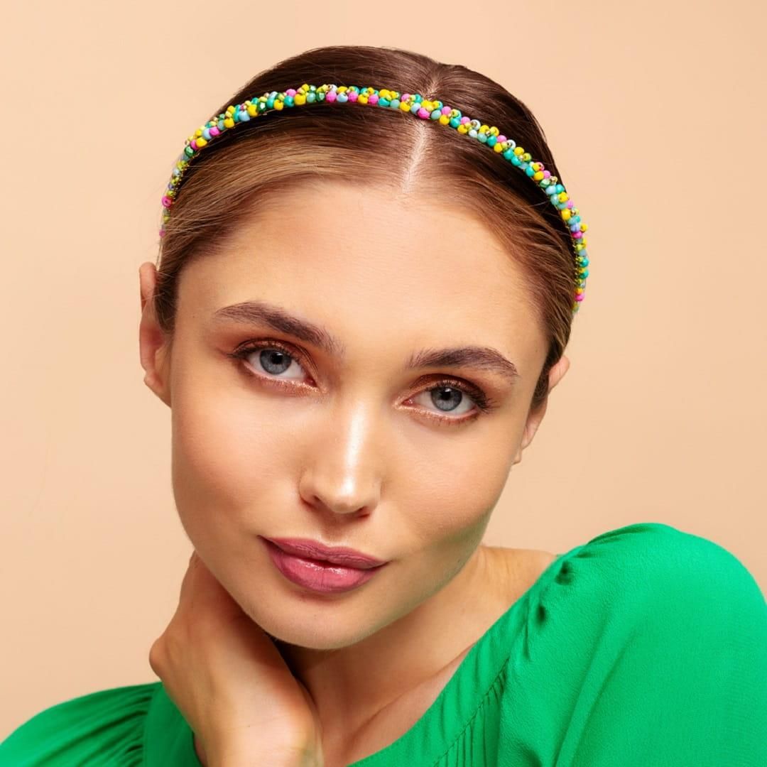 Republika Jewelry Flora - opaska do włosów Delikatna opaska, model "Flora". Ręcznie wyplatana na metalowej złoconej bazie, drobnymi szklanymi kryształami i kamieniami. Wyjątkowa i efektowna w bardzo energetycznych pastelowych kolorach. Opaska wspaniale sprawdzi się jak dodatek do wielu stylizacji. --part-- Każda opaska pakowana jest w jubilerskie, sygnowane pudełko. Rozmiar uniwersalny.