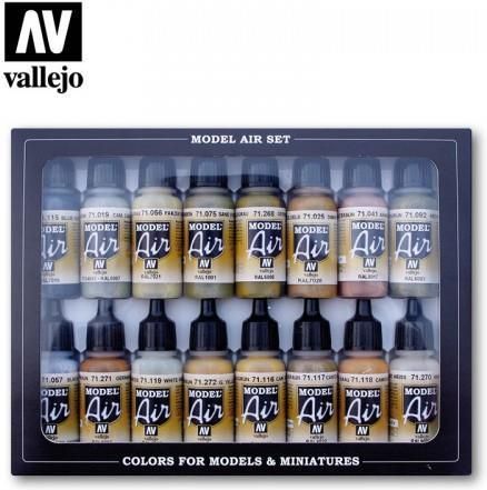 Zestaw 16 farb Model Air do malowania modeli, figurek i dioram. Zawiera 17 ml./0.57 fl.oz. (z zakraplaczem) butelki i wzornik kolorów. Zestaw zawiera: 71.115 Blue Grey 71.019 Camouflge Dark Green 71.056 Panzer Dark Grey 71.075 Ivory 71.268 German Grey 71.025 Dark Yellow 71.041 Armour Brown 71.092 Medium Olive 71.057 Black 71.271 German Red Brown 71.119 White Grey 71.272 German Green Brown 71.116 Camouflage Grey Green 71.117 Camouflage Brown 71.118 Camouflage Grey 71.270 Off-White